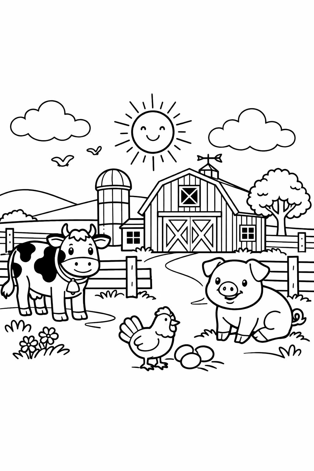 A cheerful farm setting filled with friendly animals. Great for younger colorists while still enjoyable for adults.