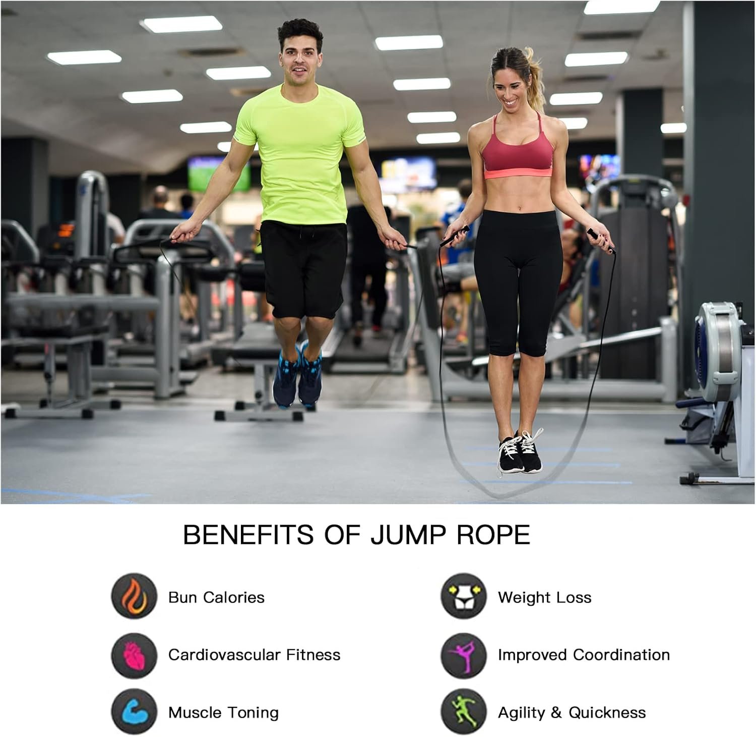 [MATERIAL] The jumping rope is made of high quality PVC material, which is strong and durable and not easy to break. The handle is made of lightweight molded polypropylene plastic to ensure you have a firm grip every time you use it.