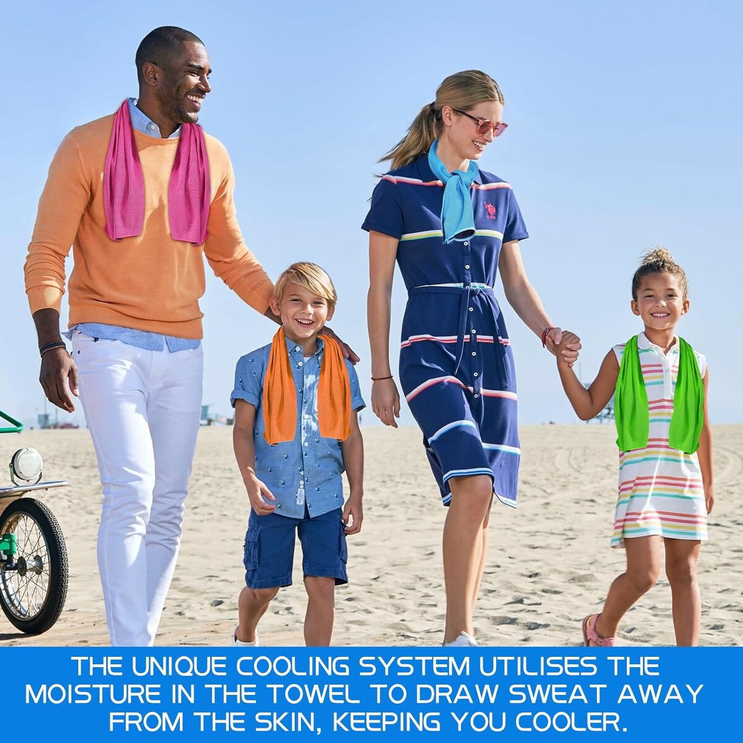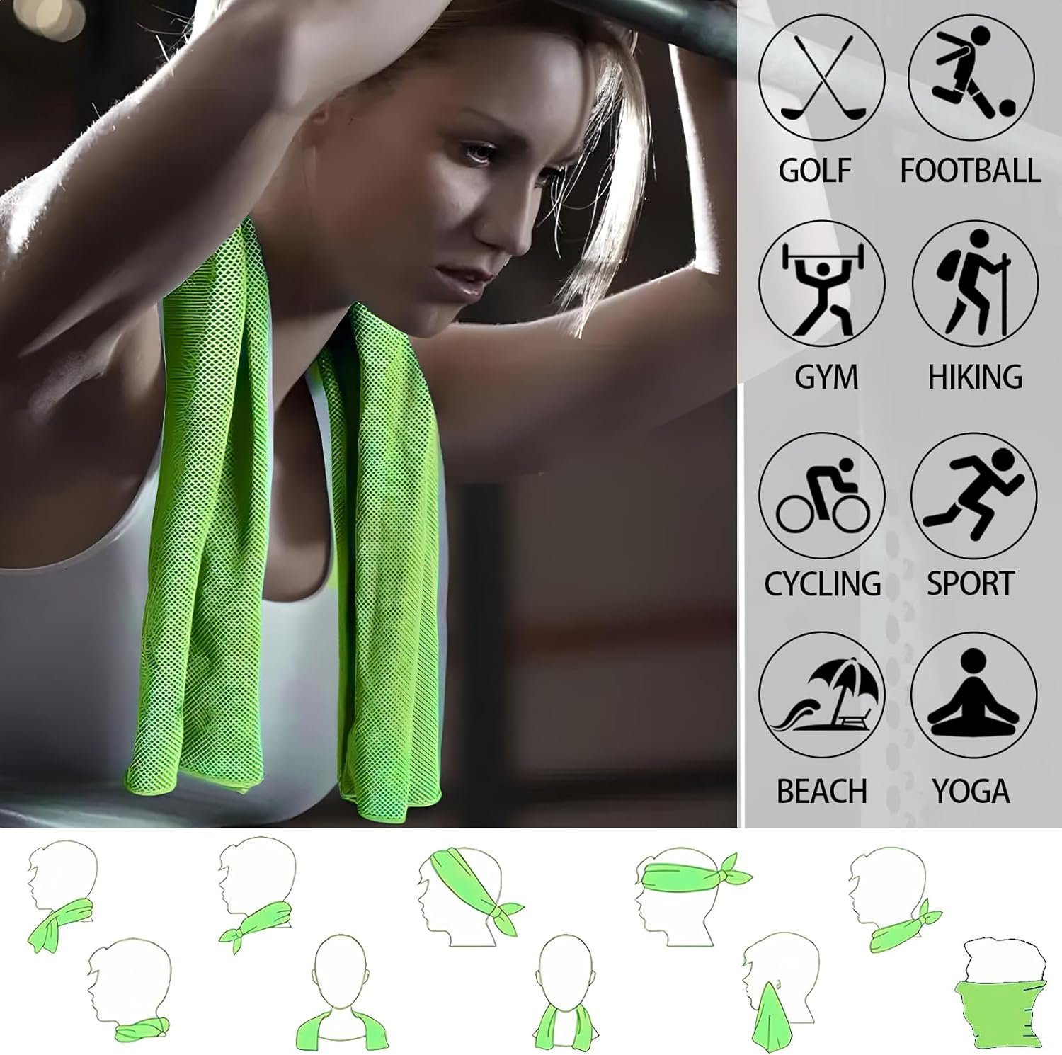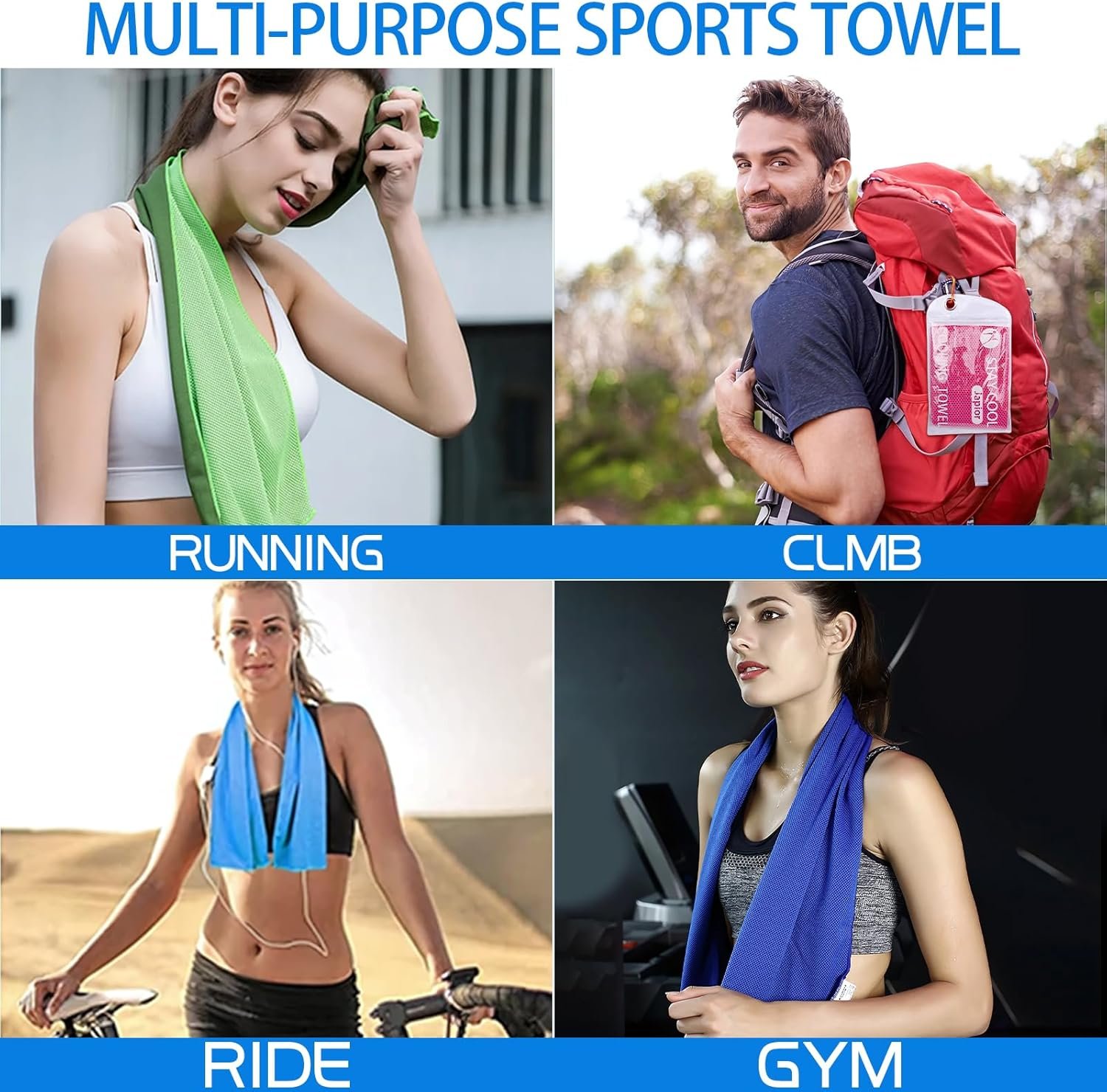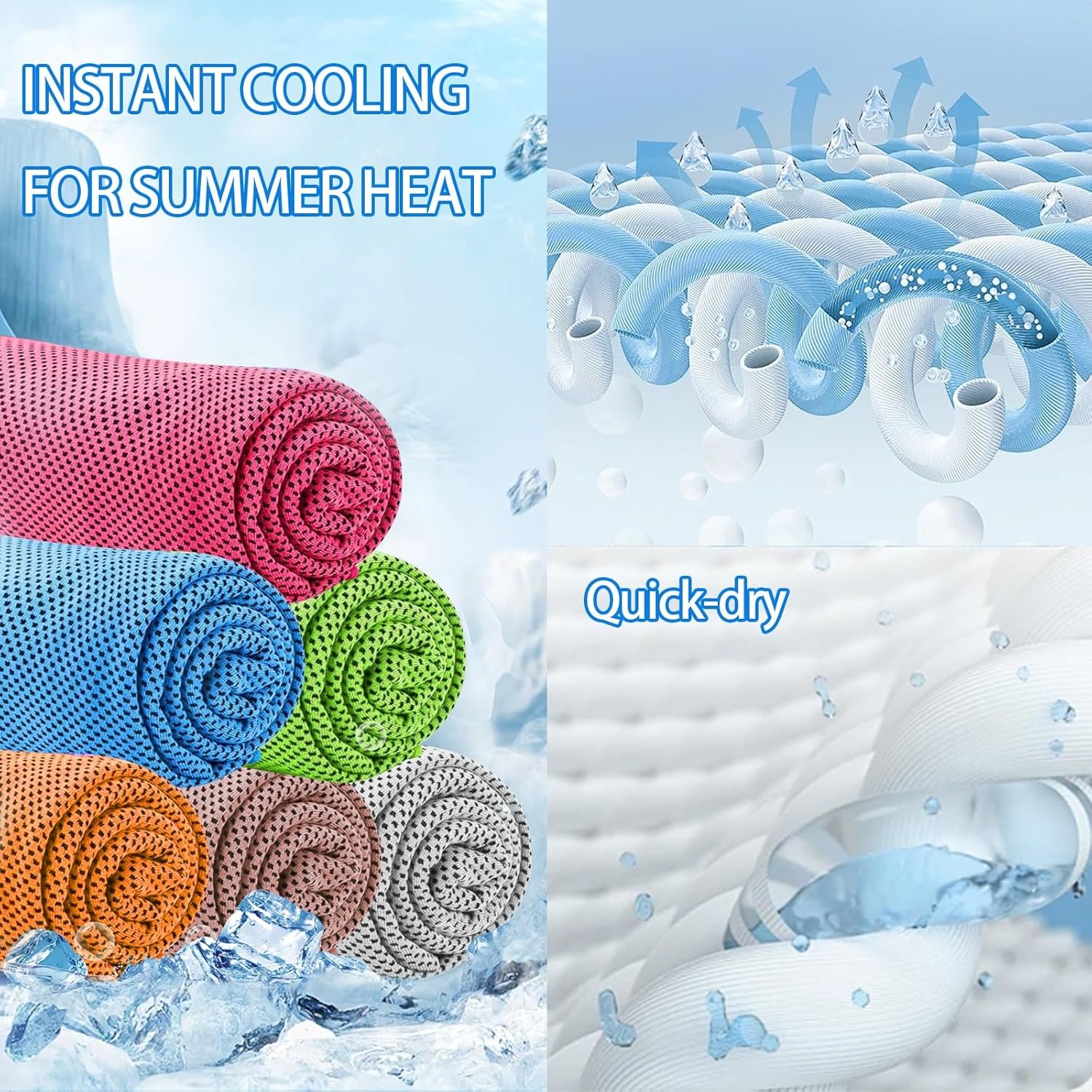 ” The package includes six beautifully packaged cooling towels, each measuring 40×12 inches (100×30 cm). Every towel comes with a PVC waterproof bag and a hiking buckle clip. Their stylish design allows you to color-coordinate with your sports attire or personal preferences, enhancing the enjoyment of your workout. These cooling towels for neck and face are essential for hot weather and make a practical gift for summer. Made from high-density microfiber with a mesh surface, the cooling towels are eco-friendly, reusable, and wear-resistant. These cooling towels for hot weather are soft, breathable, absorbent, odorless, and non-fading. During exercise, they quickly absorb sweat, accelerate water evaporation, and provide a cooling sensation. The cooling towels cool the skin through physical evaporation by absorbing sweat, keeping the skin cool and clean. To use, simply soak the cooling towels in water, wring them out, and rub them over your skin. The neck cooling towels will keep you cool for up to three hours, making them ideal neck coolers for hot weather. Lightweight and easy to use, these cooling neck wraps are perfect for extreme heat, sports, and quick-drying needs. They take up little space, are easy to store, and can be hung for convenient carrying. You can attach them to your sports bag or travel backpack for instant cooling. These cooling gadgets for hot weather are a must-have fashion item for sports, fitness, outdoor work, and indoor activities. The multifunctional cooling towels help lower body temperature, prevent heat stroke and sunburn, and can be worn on the head, neck, and wrists. These cooling rags are suitable for various sports and activities, including workouts, yoga, swimming, football, golf, and outdoor events. Use them as gym towels, workout towels, or sports towels. The cooling rags for neck are especially useful as sweat towels or gym towels for sweat. These cooling cloths for neck are hot weather essentials and perfect workout towels. “