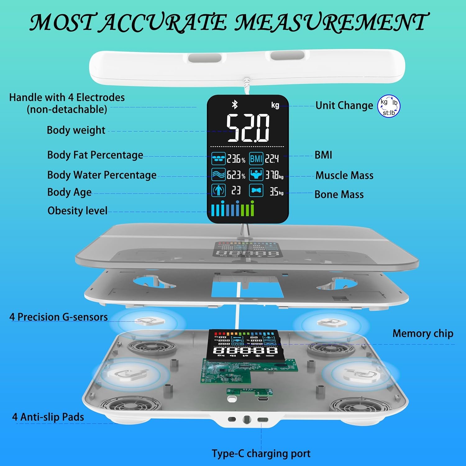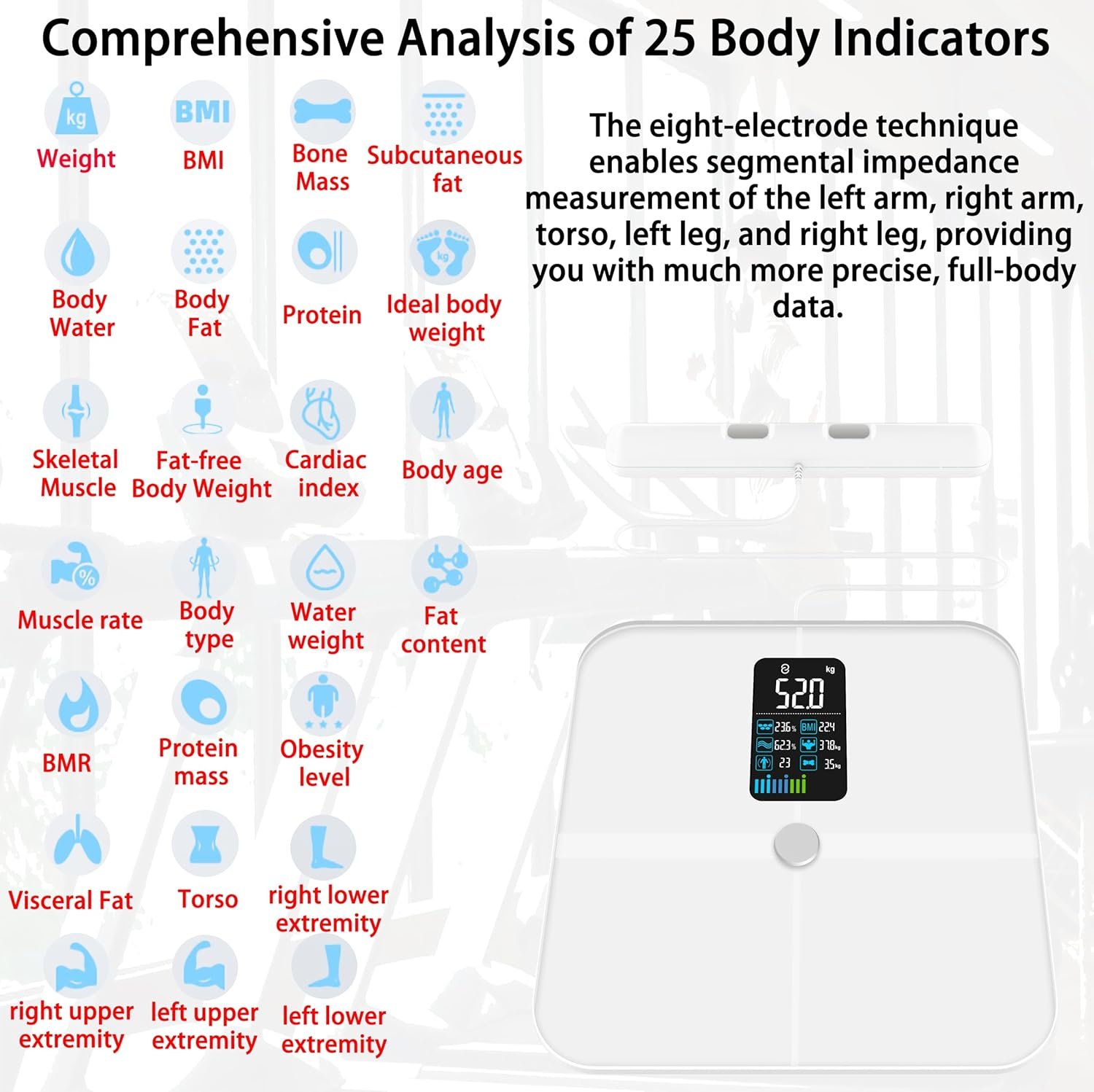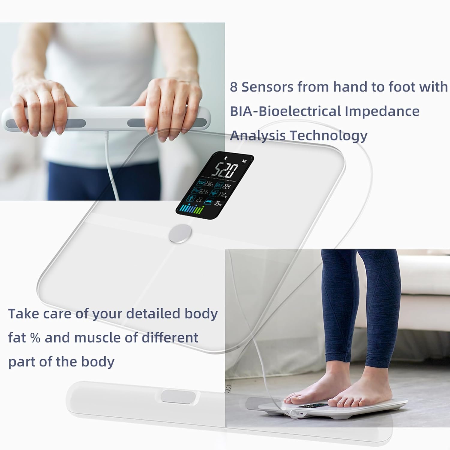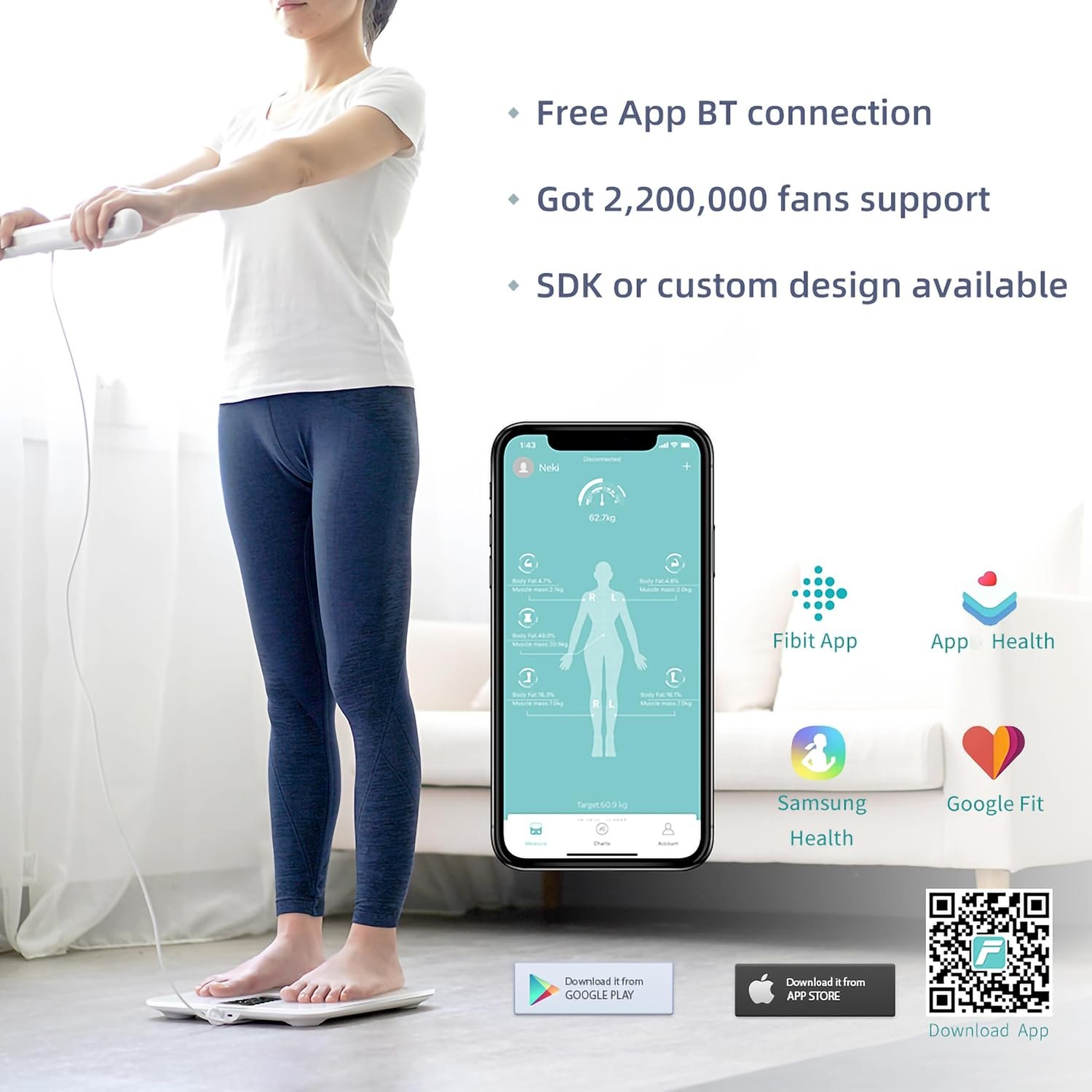 High Quality and Accuracy : This 8 Electrode Smart Body Fat Scale is equipped with 4 high-precision sensors, it can track your body weight with 0.1kg/0.2 lb accuracy, supports up to 396lb. The ITO coated sensor area fits any foot size. You can choose your preferred weight units (lb, kg, st). Unlike other 4-electrode scales that only measure half of the body, our body composition scale was made according to the resistivity model using a practical eight-electrode technique for segmental BIA, measuring 5 segmental of your body(4 limbs and torso) directly and provide you with high accuracy measurement.