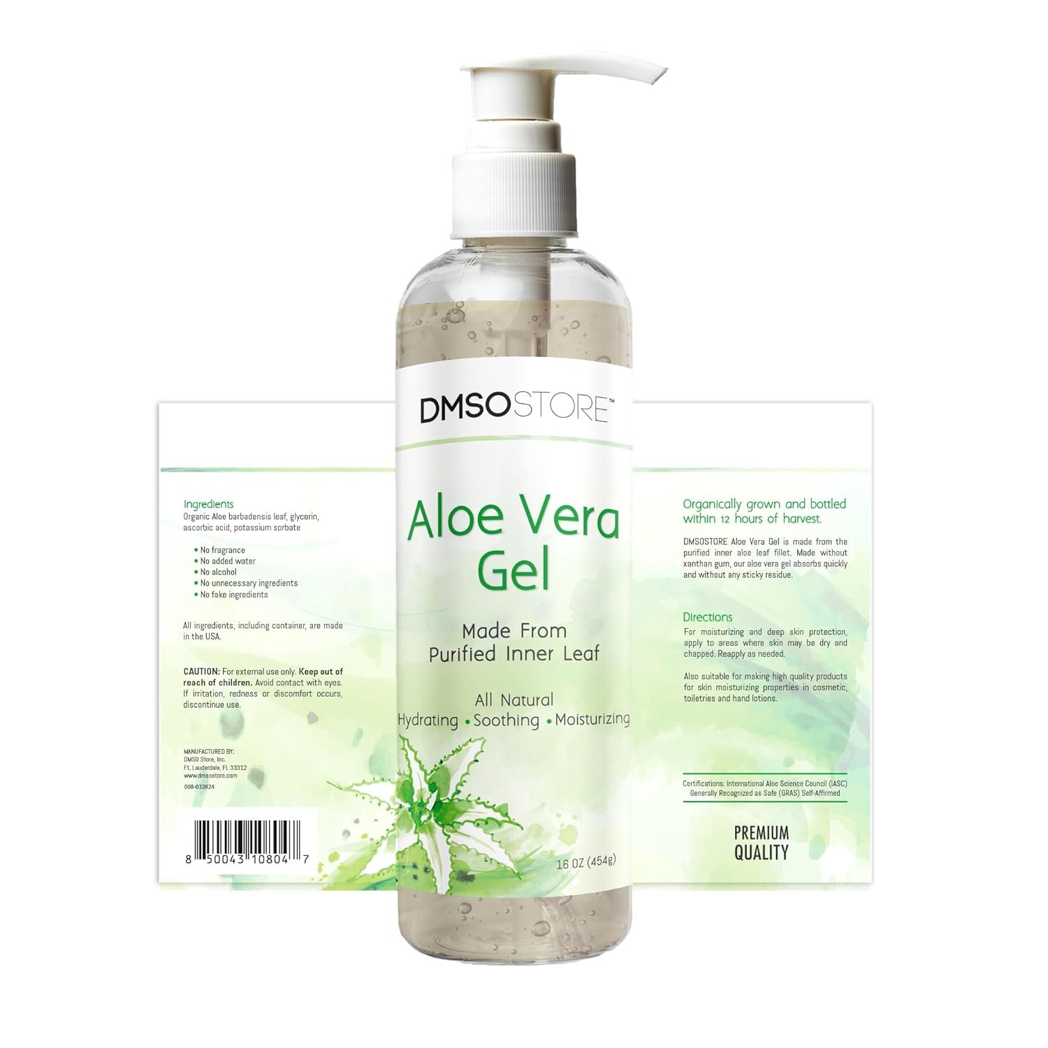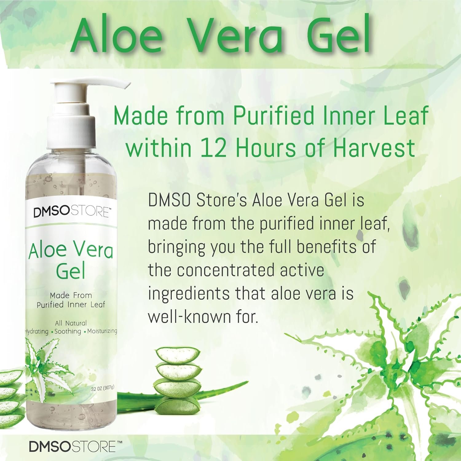Benefits of DMSOSTORE’s Aloe Vera Gel Organically grown and bottled Aloe Vera within 12 hours of harvest Made from the purified inner aloe leaf fillet No xanthan gum means our Aloe Vera absorbs quickly and doesn’t leave a sticky residue No dyes, fragrances, or alcohol