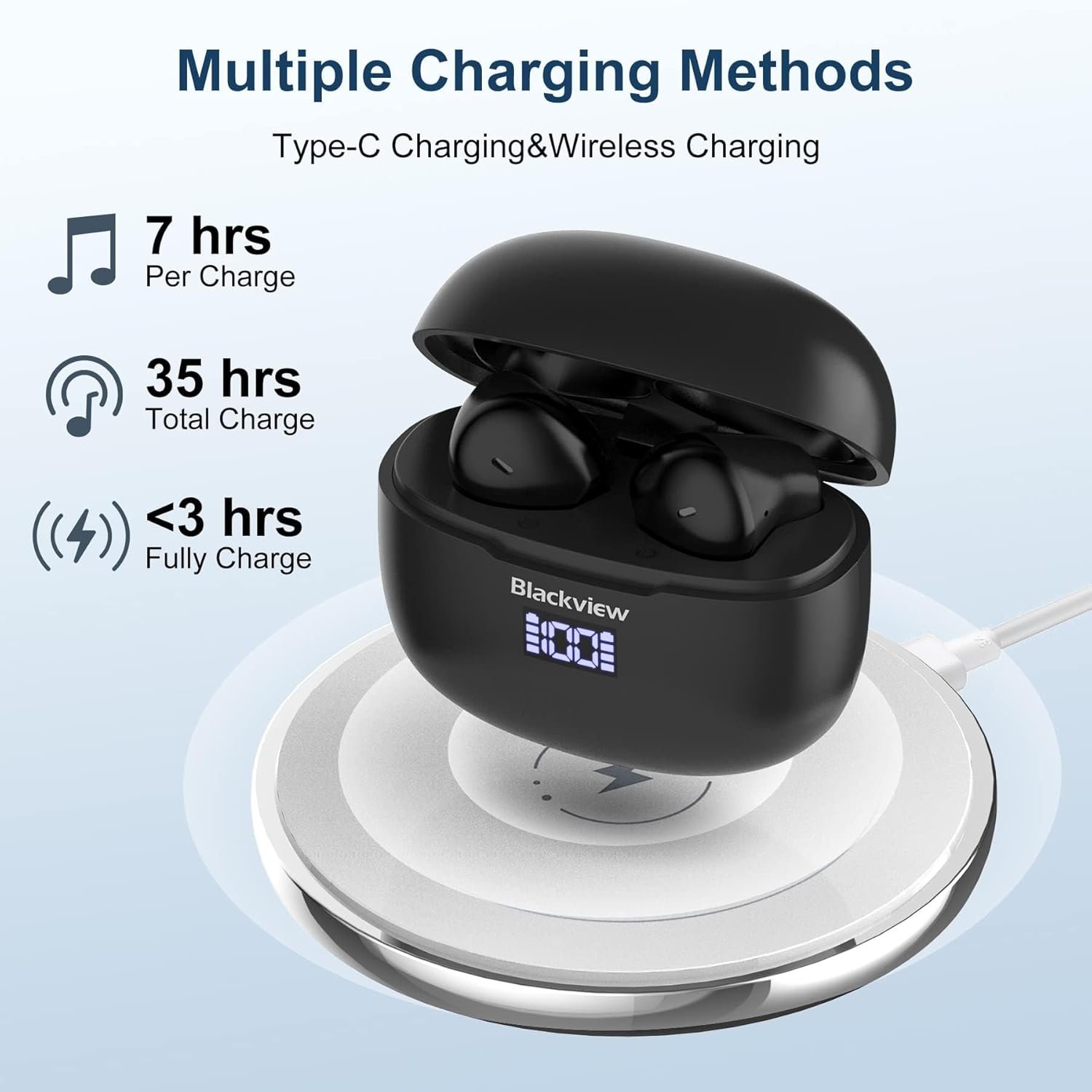 Blackview Wireless Earbuds,Bluetooth Headphones, AirBuds 7 Ear Buds Bluetooth 5.3 Deep Bass Noise Cancelling Earphones,IP7 Waterproof,LED Display 40H Playtime for Laptop Pad Phone Sports Workout Black