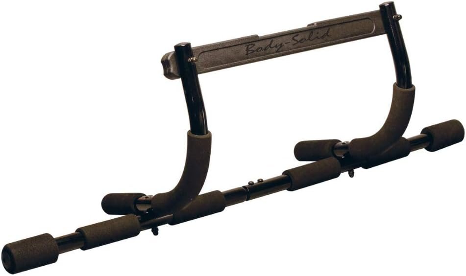 Designed to install instantly in doorways with no hardware needed, the Body-Solid Tools Chin Up Bar (PUB30) offers a compact and convenient option for bodyweight workouts at home. To use, simply place the top bar above the trim on the inside of your doorway. The pull-up bar has a cantilever design that uses your own body weight to keep it in place and can be dislodged and removed from the doorway with upward force. Two protruding close-grip handles let you work out with your palms facing each other, isolating the muscles in the center of your back that control posture. The versatile exercise bar can also be used for sit-ups by placing the bar on the floor inside a doorway, or for push-ups by simply by placing the bar on the floor. The Body-Solid Tools Chin Up Bar fits in doorways between 27.5 and 30 inches wide, and should be used in areas where the doorway trim is secure and at least 2 inches wide. It supports up to 300 pounds.