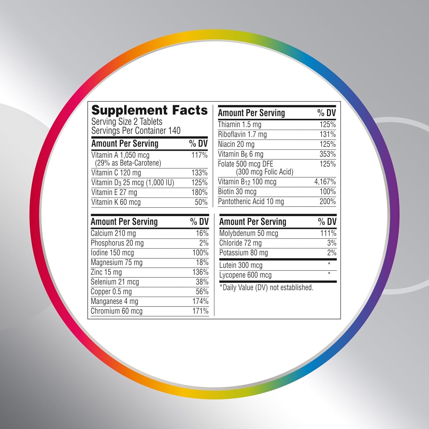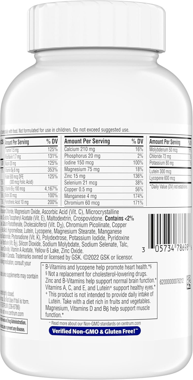 Centrum Minis Silver Multivitamin for Men 50 Plus is a multimineral supplement with micronutrients to help support wellness complete from A to zinc (1) in a 50 percent smaller tablet. The multivitamin for men over 50 contains Vitamin D and magnesium to help maintain muscle health, B-Vitamins to help promote heart health, zinc to help support brain function, lutein and Vitamins A, C, and E to support healthy eyes (1, 2, 3). The age-adjusted multivitamin for men is a verified Non-GMO (4) and gluten free multivitamin supplement for men. The men’s multivitamin has a coating that makes the multivitamins for 50 Plus easy to swallow. Centrum Silver is the number 1 Doctor recommended multivitamin brand now shown to support memory and cognition in older adults (1).* * IQVIA: Claim substantiation Validation Statement. July 2023. IQVIA, using the ProVoice Survey, recorded the product recommended most often within the Adult Multivitamins category by physicians and pharmacists in the United States. A statistically significant majority of the panel of physicians and pharmacists responded that Centrum is the product they endorse most.(1) These statements have not been evaluated by the Food and Drug Administration. This product is not intended to diagnose, treat, cure or prevent any disease.(2) Not a replacement for cholesterol-lowering drugs (1) (3) Read more about our Non-GMO standard on Centrum’s official website.