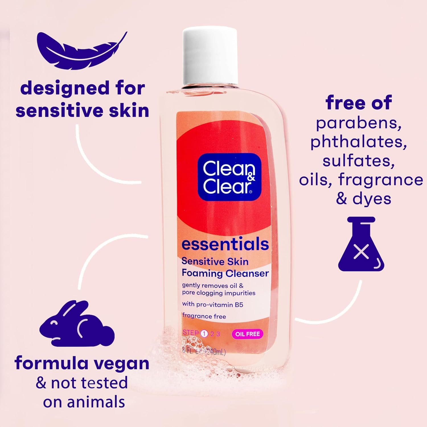 Clean & Clear Essentials Oil-Free Daily Foaming Facial Cleanser with Pro-Vitamin B5 gently removes oil and pore clogging impurities. Specially designed for sensitive skin, this fragrance free foaming face wash nourishes skin and gently cleanses without drying. Its oil-free formula supports the skin’s moisture barrier for clean, healthy-looking skin. The gentle and effective foaming cleanser is formulated without parabens, phthalates, sulfates, oils, dyes and fragrance. The vegan formula is not tested on animals and is packaged in a bottle made with 50% recycled plastic. To use, we face, apply the daily cleanser to hands and work into a lather. Massage face gently and rinse thoroughly. Use this fragrance-free foaming facial cleanser as part of a daily skincare routine with Clean & Clear.