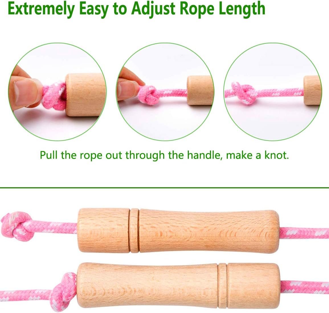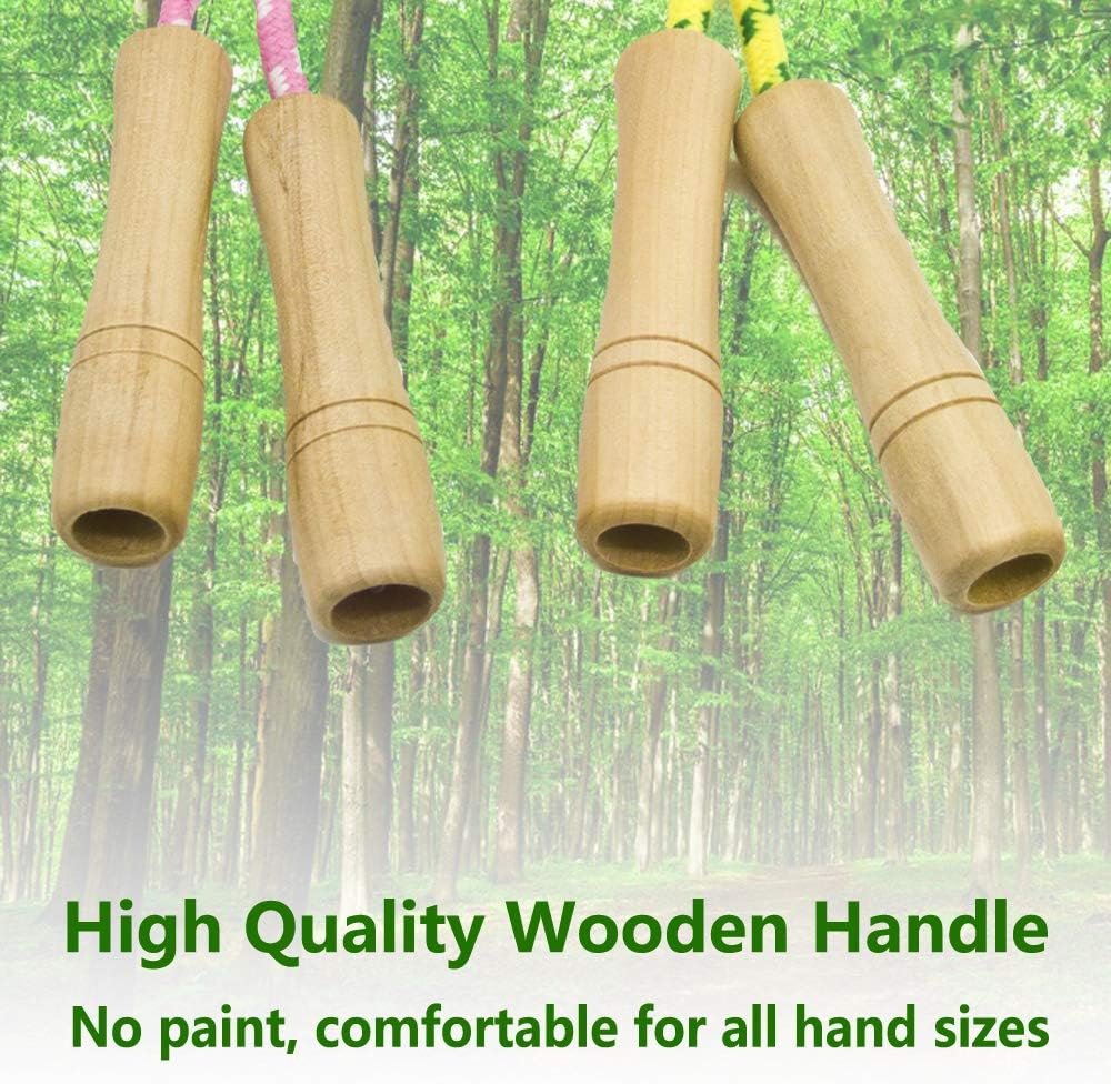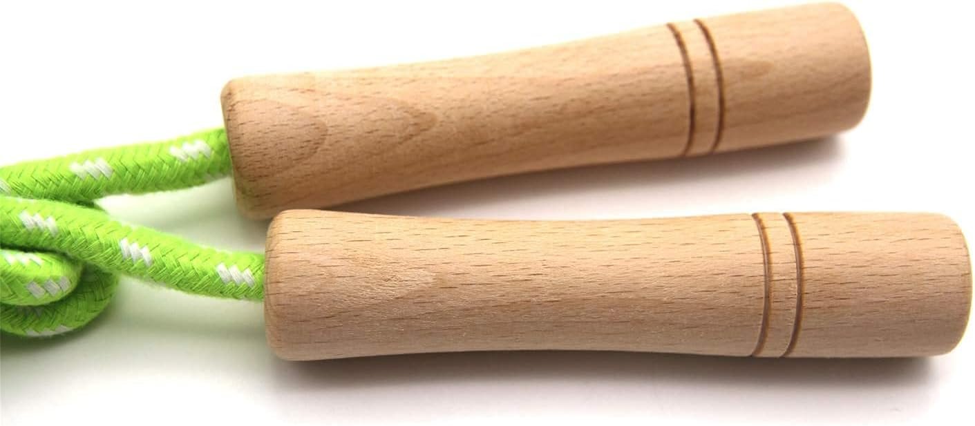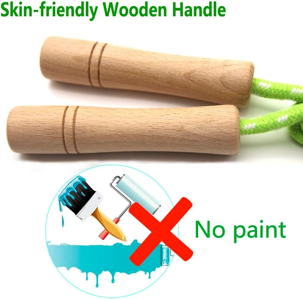 High-Quality & Safe Design – Crafted with non-toxic, odorless wooden handles, the smooth, 3.9-inch grips are designed to fit comfortably in kids’ hands. The lightweight cotton-braided rope is durable, tangle-free, and gentle—leaving no harsh whip marks.