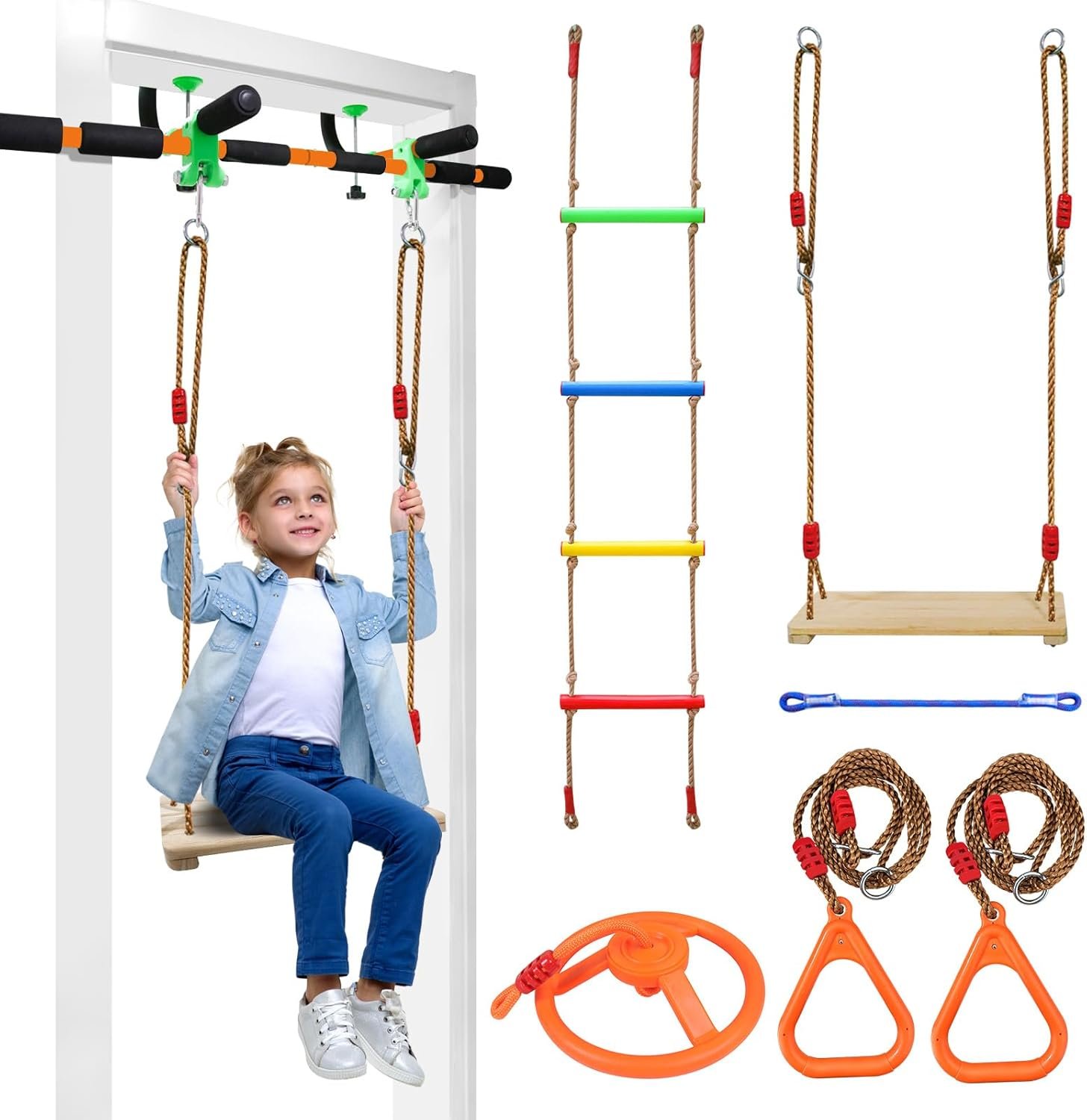 You Will Get ★The Indoor Pull Up Bar contains a wooden swing, Rotate Disc (with connetcing rope), rope ladder, children large lifting ring ,which can be adjusted according to the height of the door frame. Simple Installation There is no need to drill holes on the wall, just assemble the door frame swing