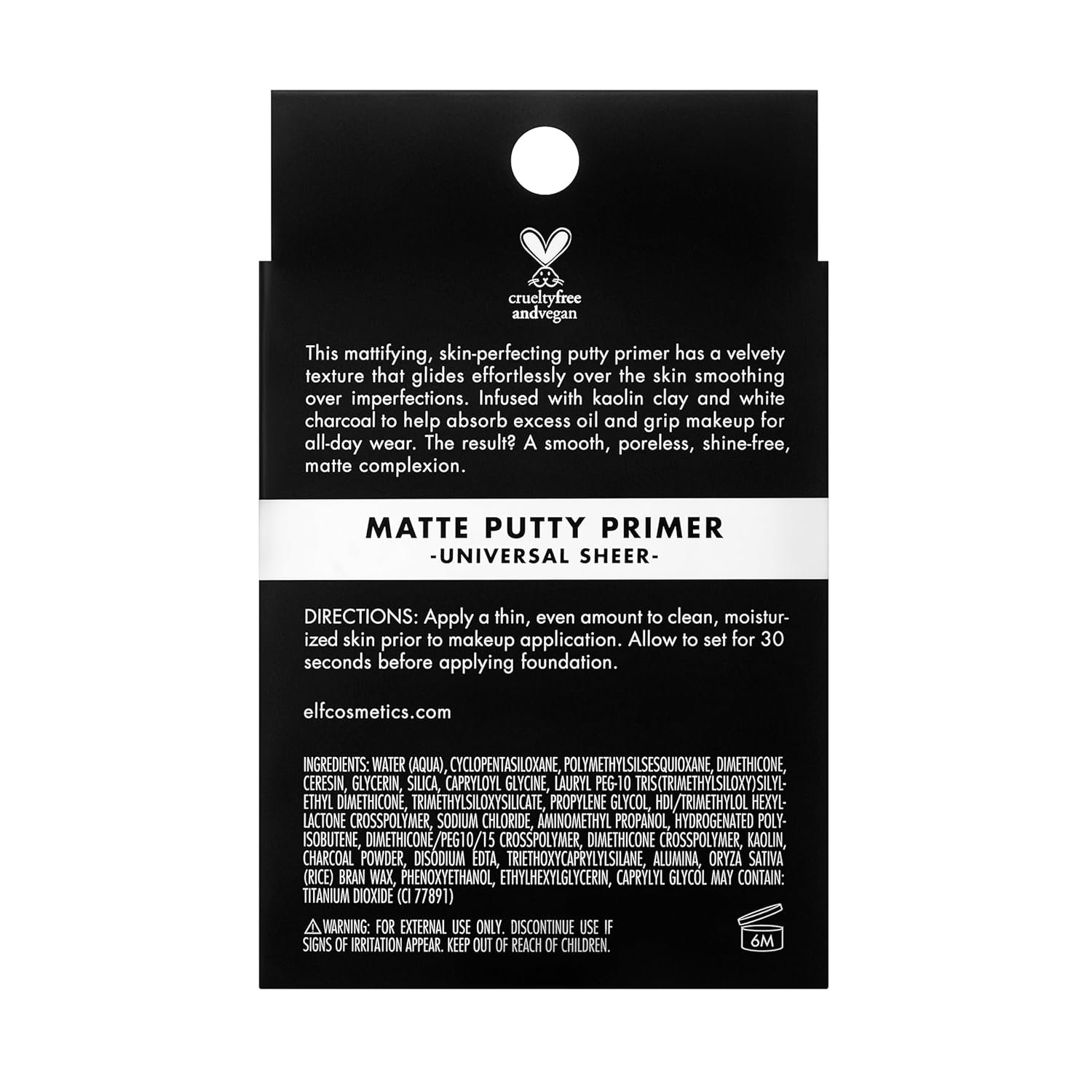 SHINE FREE FINISH: This skin perfecting putty primer is infused with kaolin and white charcoal. Velvety texture glides effortlessly over the skin, smoothing over imperfections for a poreless effect