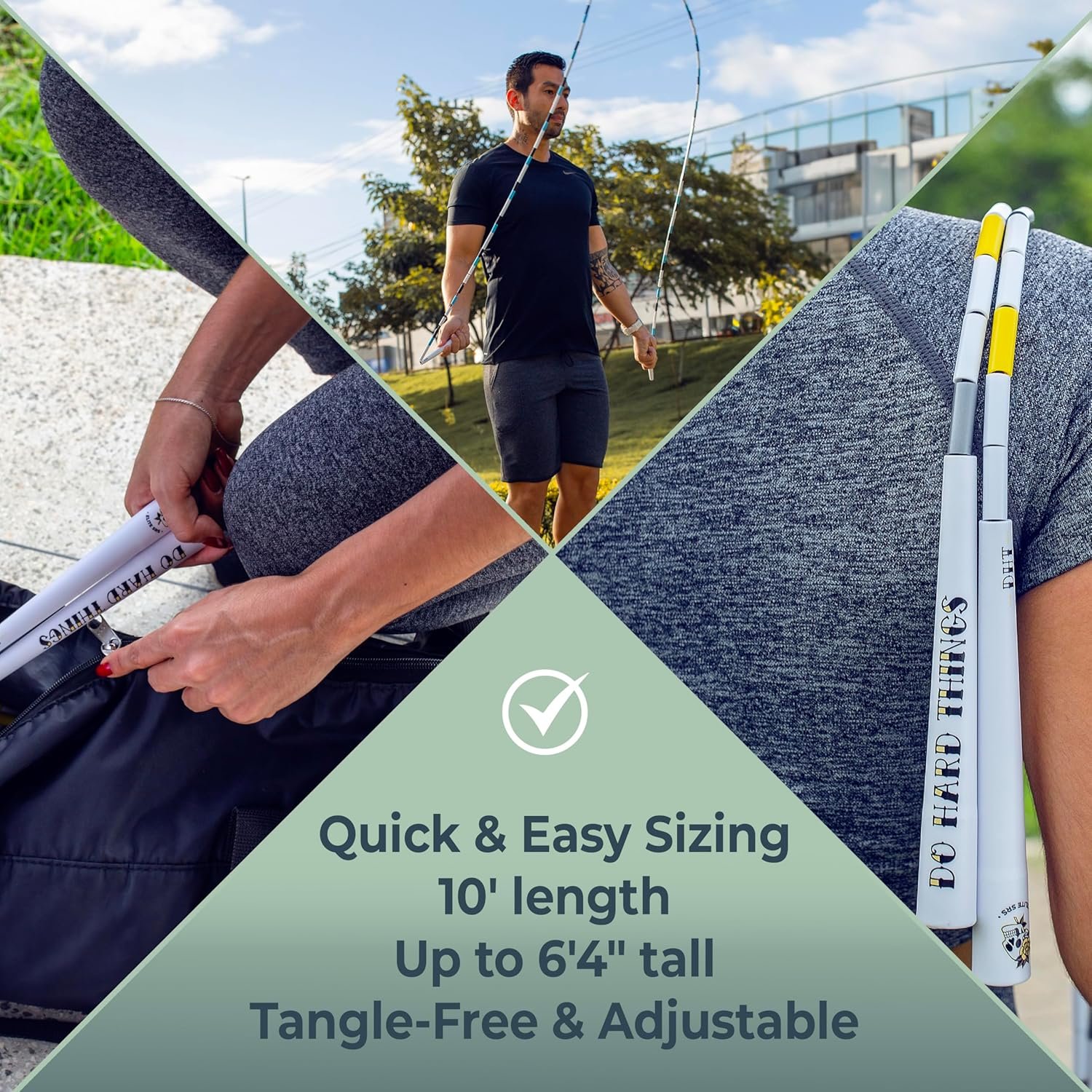 Adjustable Length – The adjustable length allows our Do Hard Things Beaded Jump Rope to fit jumpers of all ages and sizes. Its 10’ length fits jumpers up to 6′ 4 ” tall. Simply adjust the jump rope by loosening the washer/tie on the handle, removing beads, and cutting excess cord.