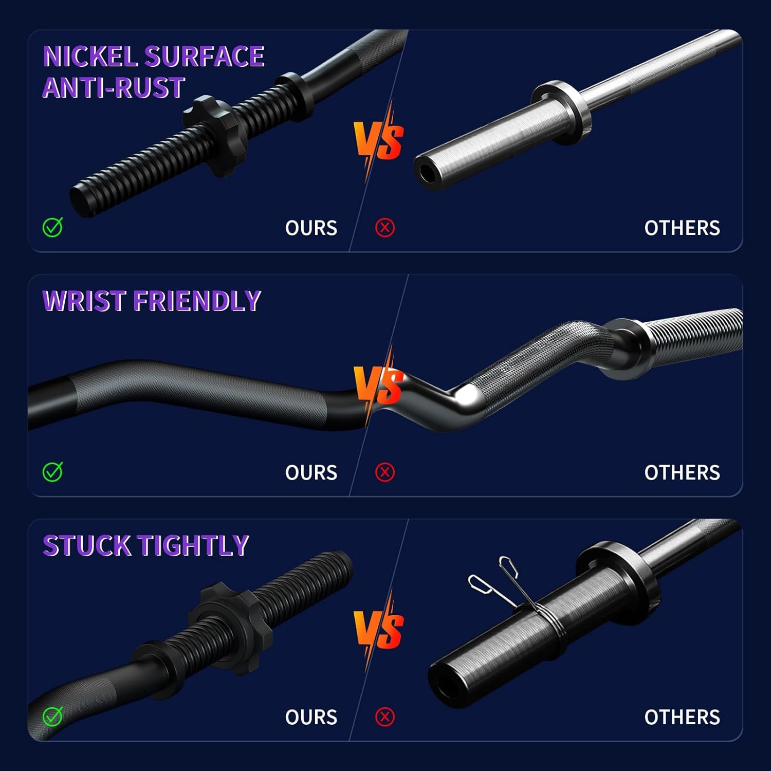 HEAVY-DUTY CHROME STEEL: Our steel rods feature hardened nickel plating for good corrosion and oxidation resistance, Comes with 2 pcs Anti-slips swivel steel clamps to hold 1″ weight plates.