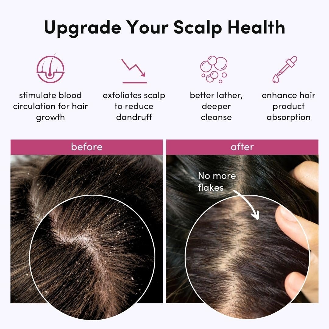 Wet & Dry Use – This innovative dual-sided brush head offers a soft, flexible side (dry use) for stimulating hair growth through scalp exfoliation, while the firmer side (wet use) deep cleanses to promote overall hair health.