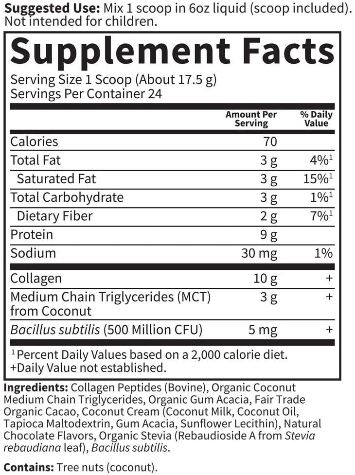 COLLAGEN MCT POWDER FOR ENERGY, HAIR, SKIN, NAILS AND JOINTS: Support healthy hair, skin, nails, joints, and energy with 10g Grass Fed Collagen and 3g Coconut MCTs, plus 500 Million CFU Probiotics for digestion, in a delicious Chocolate flavor