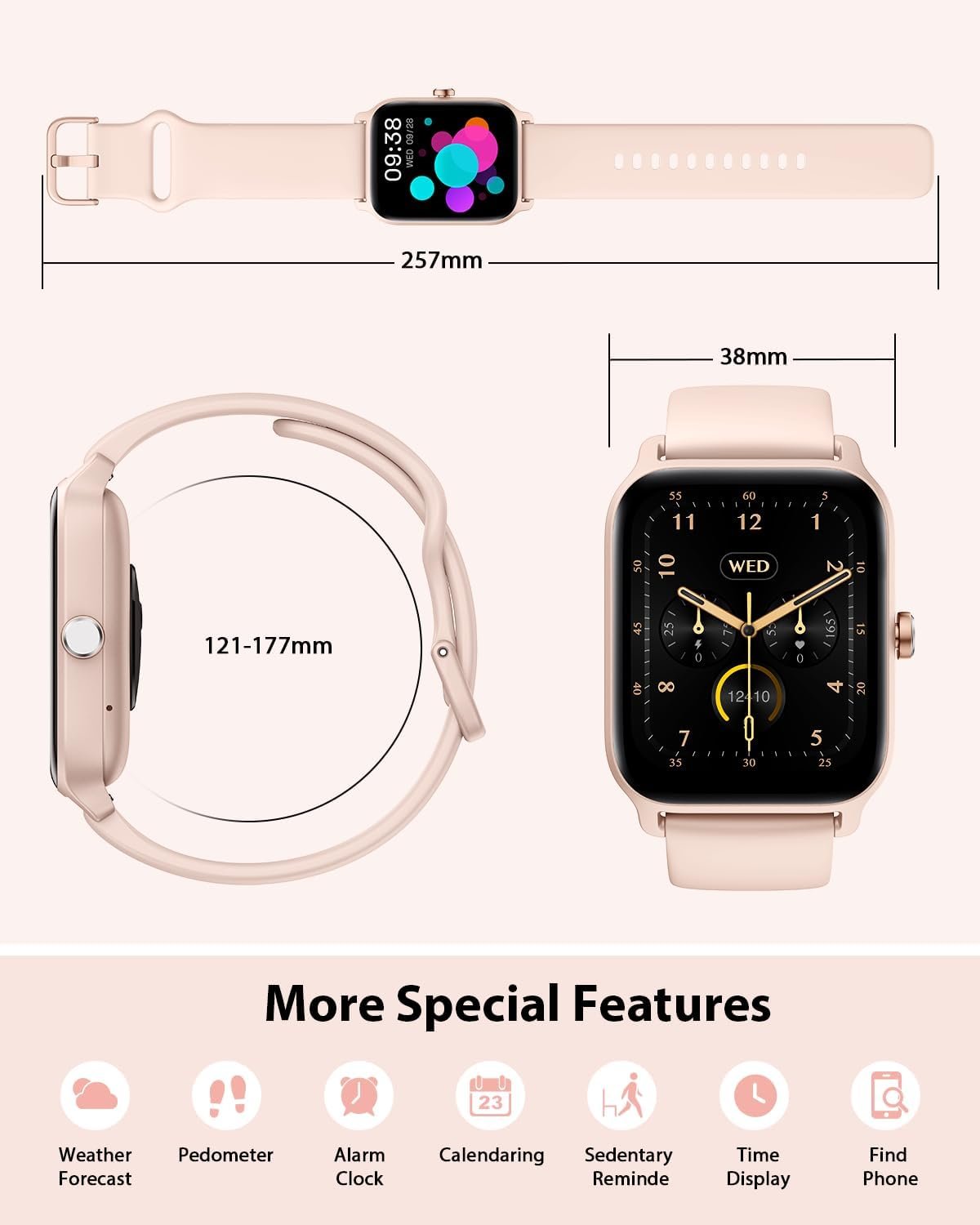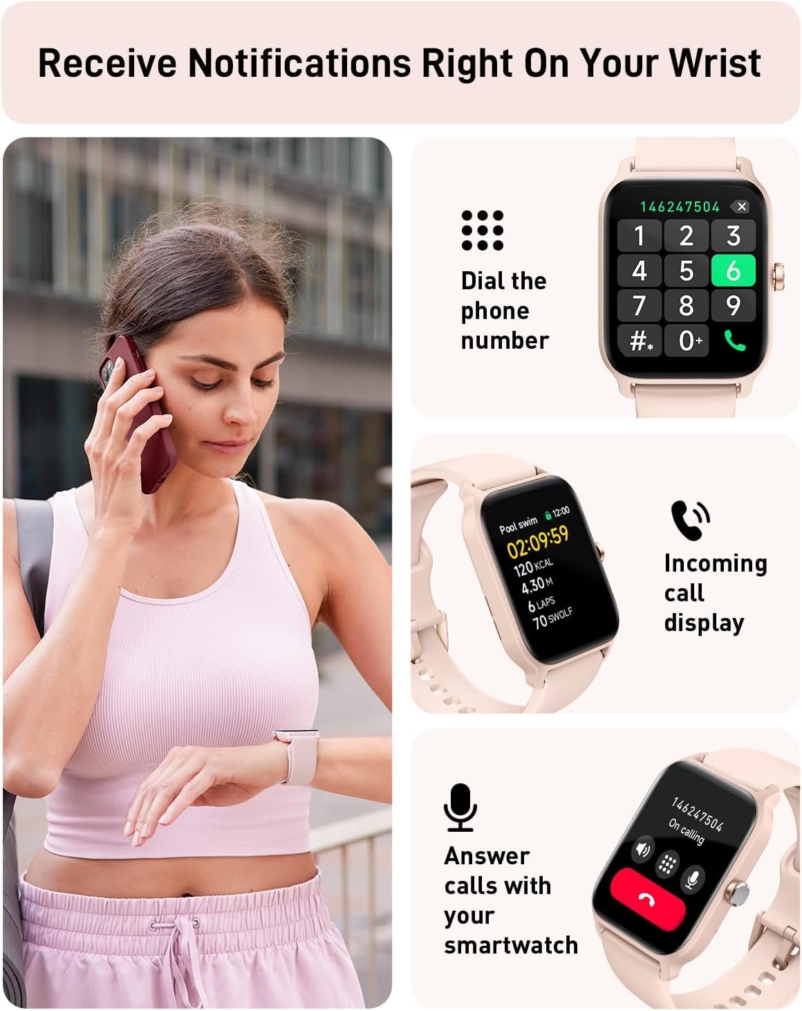 【Message Notification & Versatile Functions】Stay updated with message notifications from SMS, Facebook, WhatsApp, Instagram, Telegram, TikTok, Skype, and more on your wrist. This fitness watch also packs features like Bluetooth calling, medication reminders, cycle tracking, weather updates, music and camera controls, alarms, stopwatch, timer, breathing exercises, raise-to-wake, and find-my-phone.