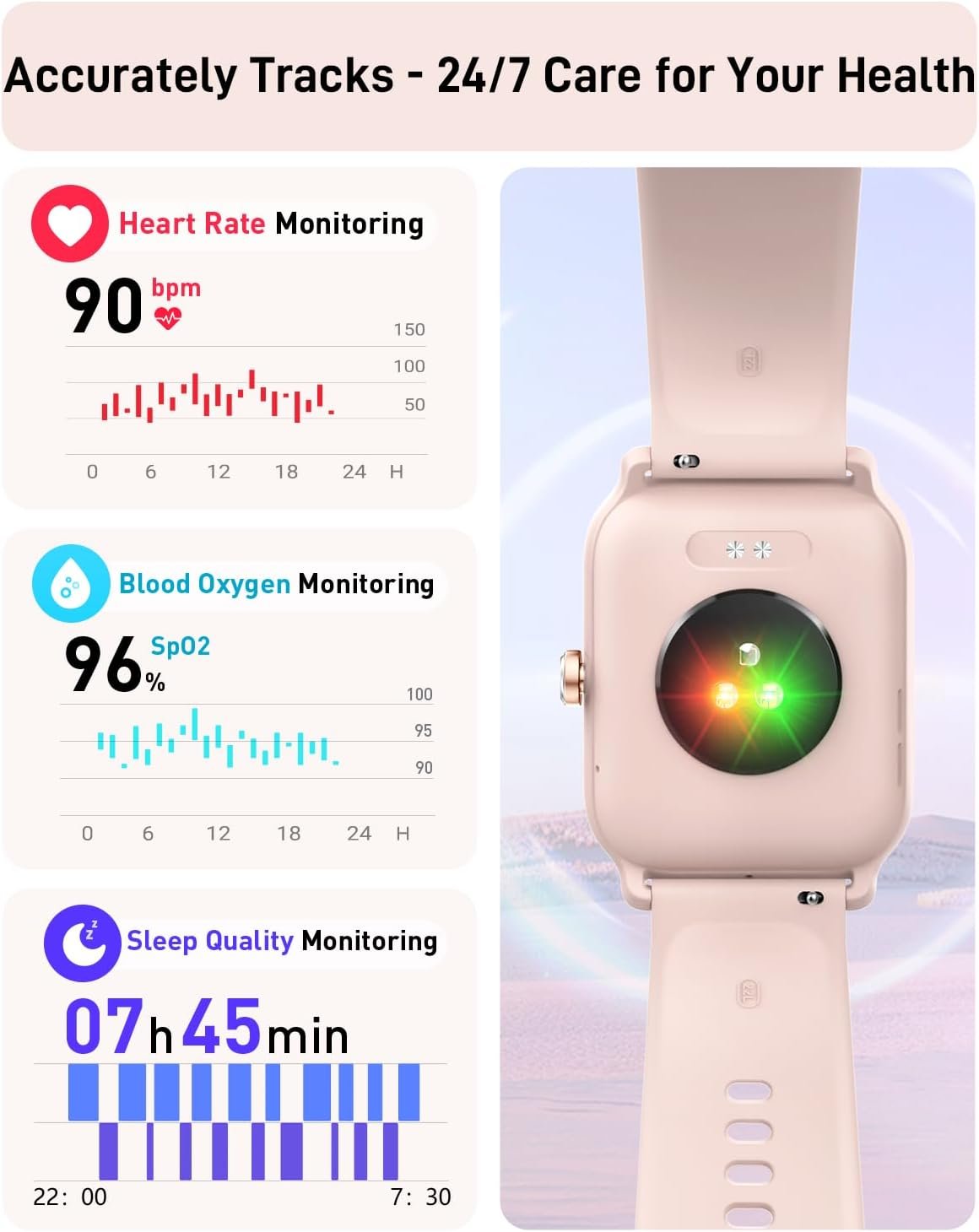 【24/7 Accurate Health Monitoring】This fitness tracker watch provides comprehensive 24/7 health monitoring, continuously logging your daily steps, distance traveled, and calorie burn. It’s equipped with sophisticated sensors that keep a close watch on your heart rate, blood oxygen, stress, and sleep patterns. All collected data can be effortlessly synced with your smartphone for in-depth analysis, offering actionable insights into your health and helping you make informed lifestyle choices.