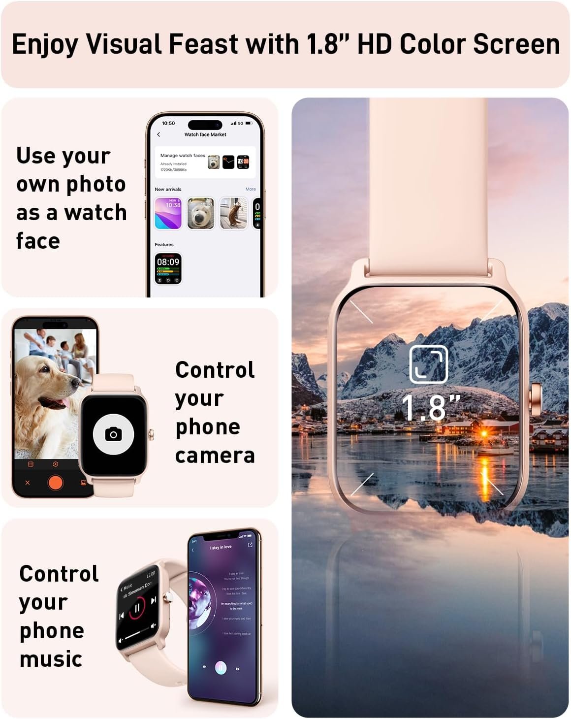 【1.8″ Ultra HD Screen & 101+ Dials】The smart watch boasts a spacious 1.8-inch HD display, offering vibrant image quality and swift touch responsiveness. Unleash your creativity with a diverse selection of over 101+ watch faces, or customize your own by uploading a cherished photo. Seamlessly pairs with iOS and Android smartphones (iOS 9.0+, Android 6.0+). A full charge in 2.5 hours offers up to 7 days of use or 30 days on standby.