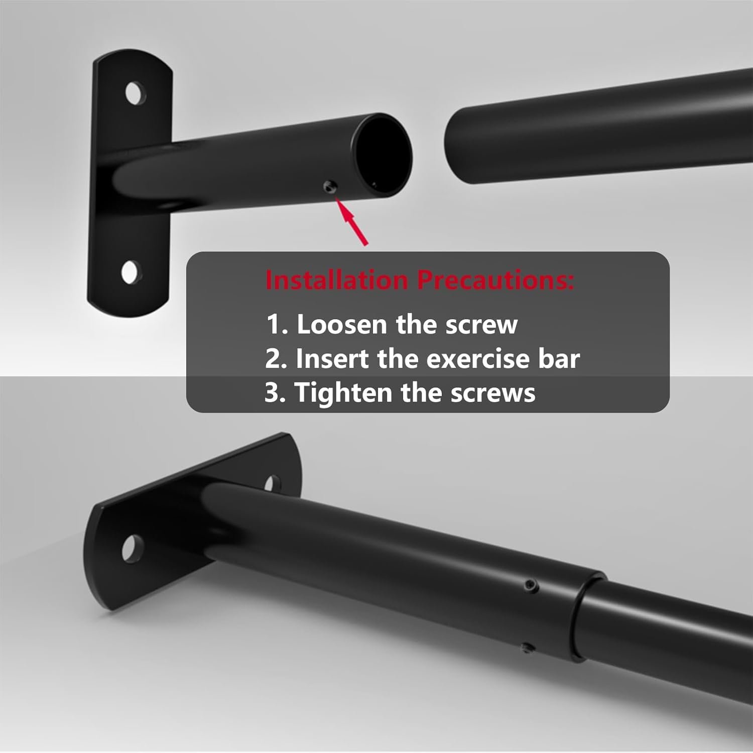 Easy installation: Follow our simple three-step installation process to securely mount the exercise bar in your doorway. 1. Loosen the screw 2. Insert the exercise bar 3. Tighten the screws