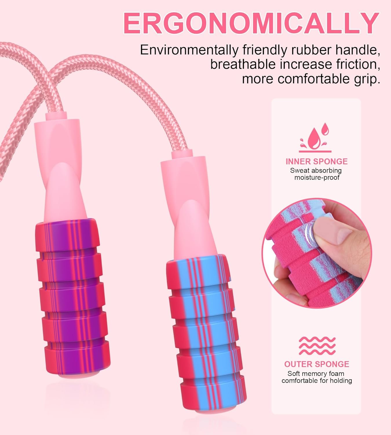 【Soft Foam Handles】 The handles of adult jump rope are designed with soft memory foam and a grooved pattern for better grip and comfort. They are nonslip, waterproof, and sweat-absorbent, which makes them comfortable to hold during workouts.