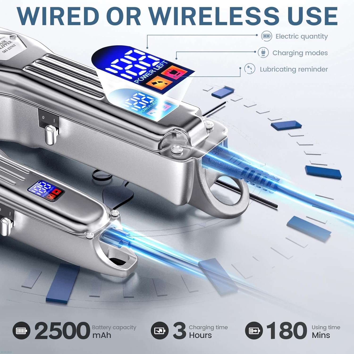 LED Display and Ergonomic Handle: The built-in digital display allows you to quickly check power reminders, lubrication reminders, and charging status. The hair trimmer contains a high-capacity lithium-ion battery (2500 mAh), providing 5 hours of usage after 180 minutes of charging. These professional hair clippers are comfortable to hold, convenient to use, and easy to clean