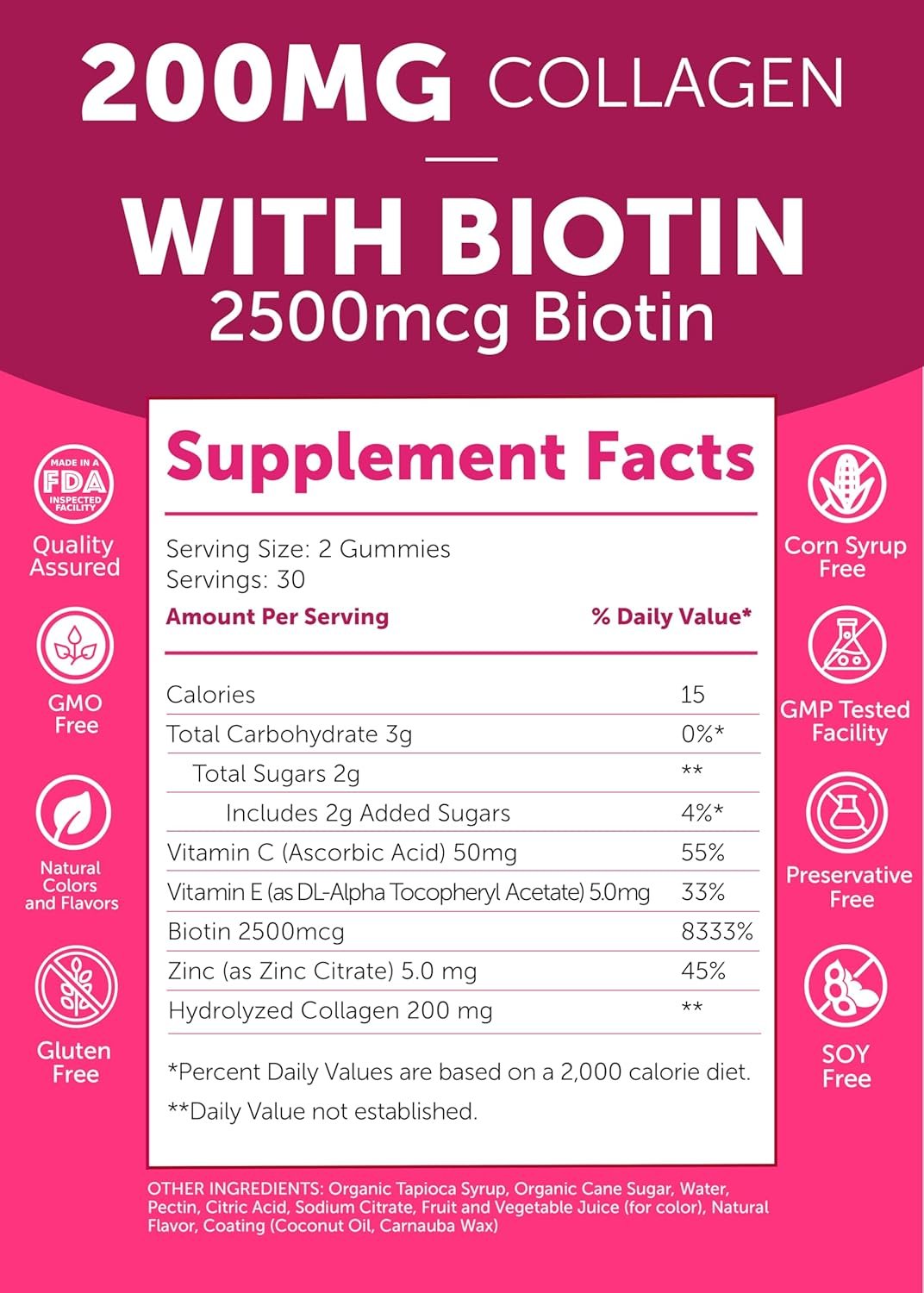 Premium Quality Ingredients: Each gummy is packed with 200mg of hydrolyzed collagen, biotin, zinc, and vitamins C & E, carefully selected to support your overall health.