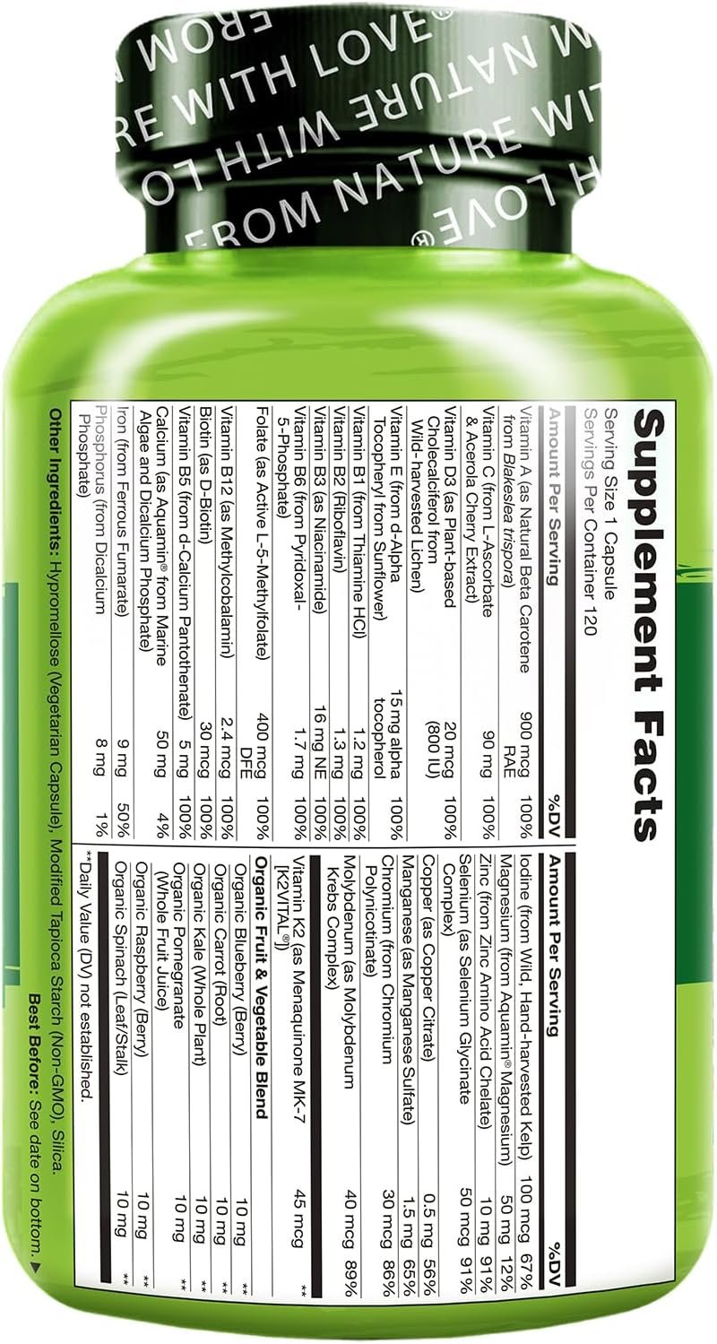 Plant-Based: Featuring premium plant-based vitamins and minerals such as Vitamin D3 from wild-harvested lichen, Vitamin E from sunflower, Calcium and Magnesium from marine algae, and Iodine from kelp.
