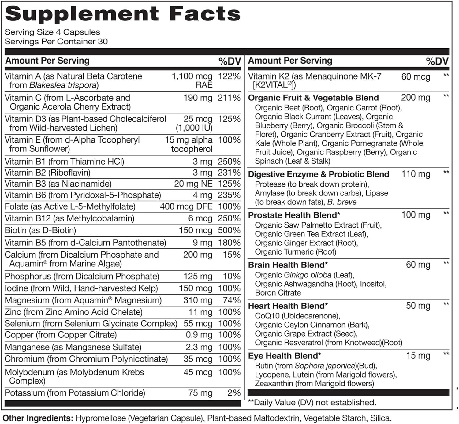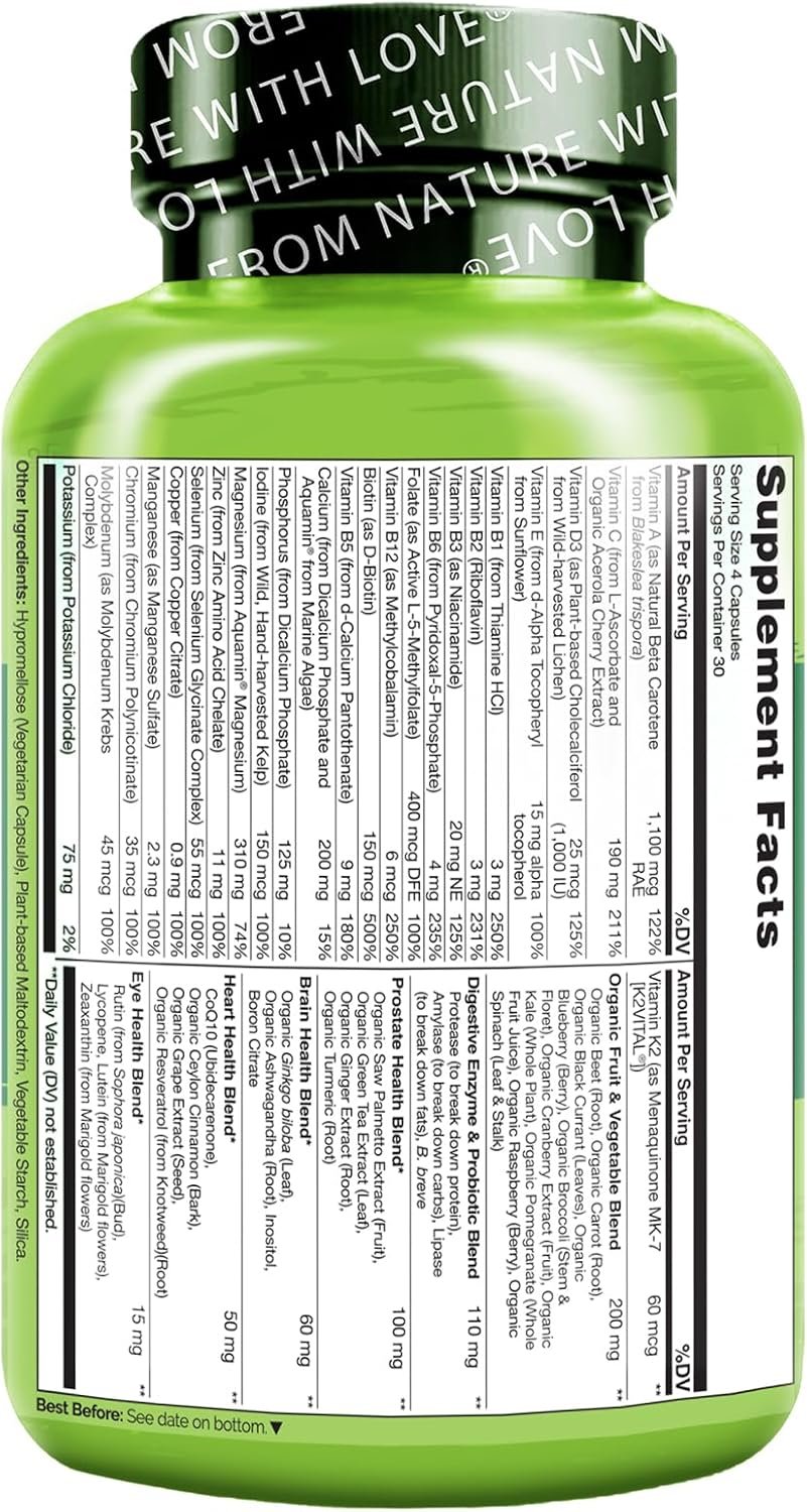 Premium Plant-Based Ingredients: Our Whole Food Multivitamins are made with plant-based vitamins and minerals including Vitamin D3 from lichen, Vitamin E from Sunflower, and Calcium and Magnesium from marine algae.
