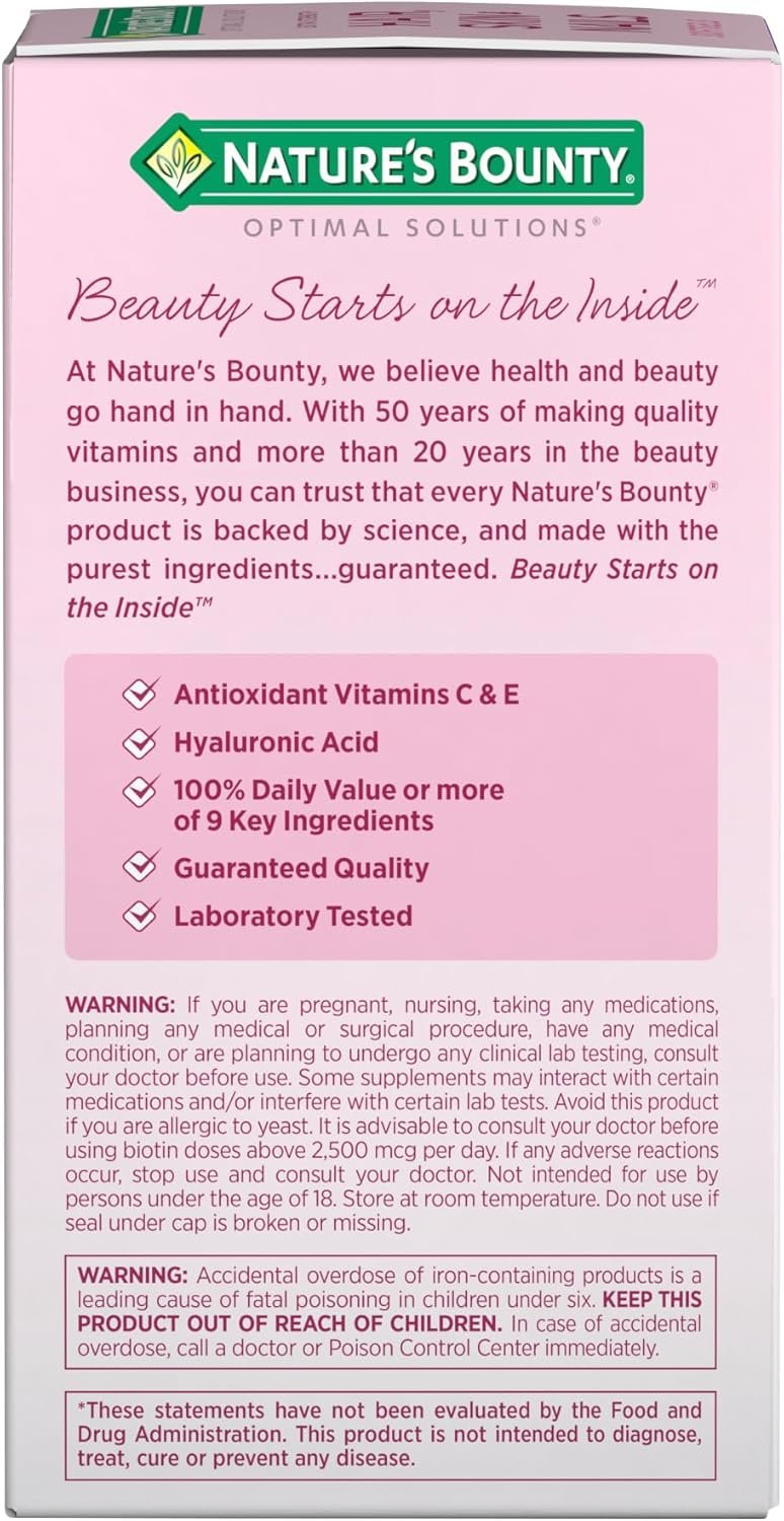 From the #1 brand for hair, skin, and nails,(2) Nature’s Bounty Extra Strength Hair, Skin & Nails Rapid Release Softgels are packed with biotin and contain antioxidant vitamins C & E plus hyaluronic acid and vital nutrients to support beautiful hair, glowing skin, and healthy nails from the inside, out.(1) Each serving of our softgels contains antioxidant vitamins A, C & E plus hyaluronic acid and biotin to help support and maintain healthy hair, skin, and nails.(1) Vitamin E contributes to skin health, and vitamin C is involved in collagen production and formation, which forms the basis for vibrant skin, whereas biotin helps to maintain healthy hair.(1) Every Nature’s Bounty beauty supplement is backed by a combination of nature and science and made with the purest ingredients, guaranteed. Our unique formula is laboratory-tested plus is free of milk, lactose, soy, gluten, wheat, yeast, or fish. If you’re hoping to look and feel your best, Nature’s Bounty Hair, Skin & Nails vitamins for women are a great way to support your natural beauty from within.