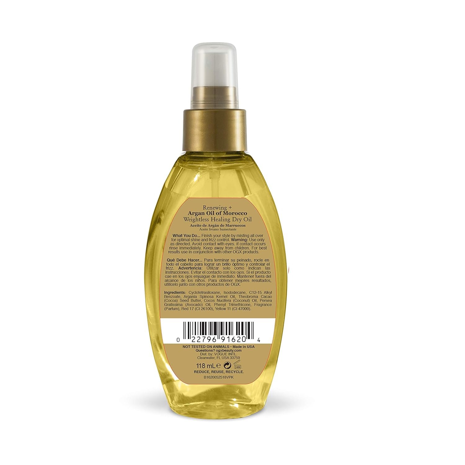 HEAL SPLIT ENDS and CONTROL FRIZZ: The 4-ounce spray bottle of OGX Renewing plus Argan Oil of Morocco Weightless Healing Dry Oil Spray helps mend split ends, smooth hair and eliminate frizzy flyaways