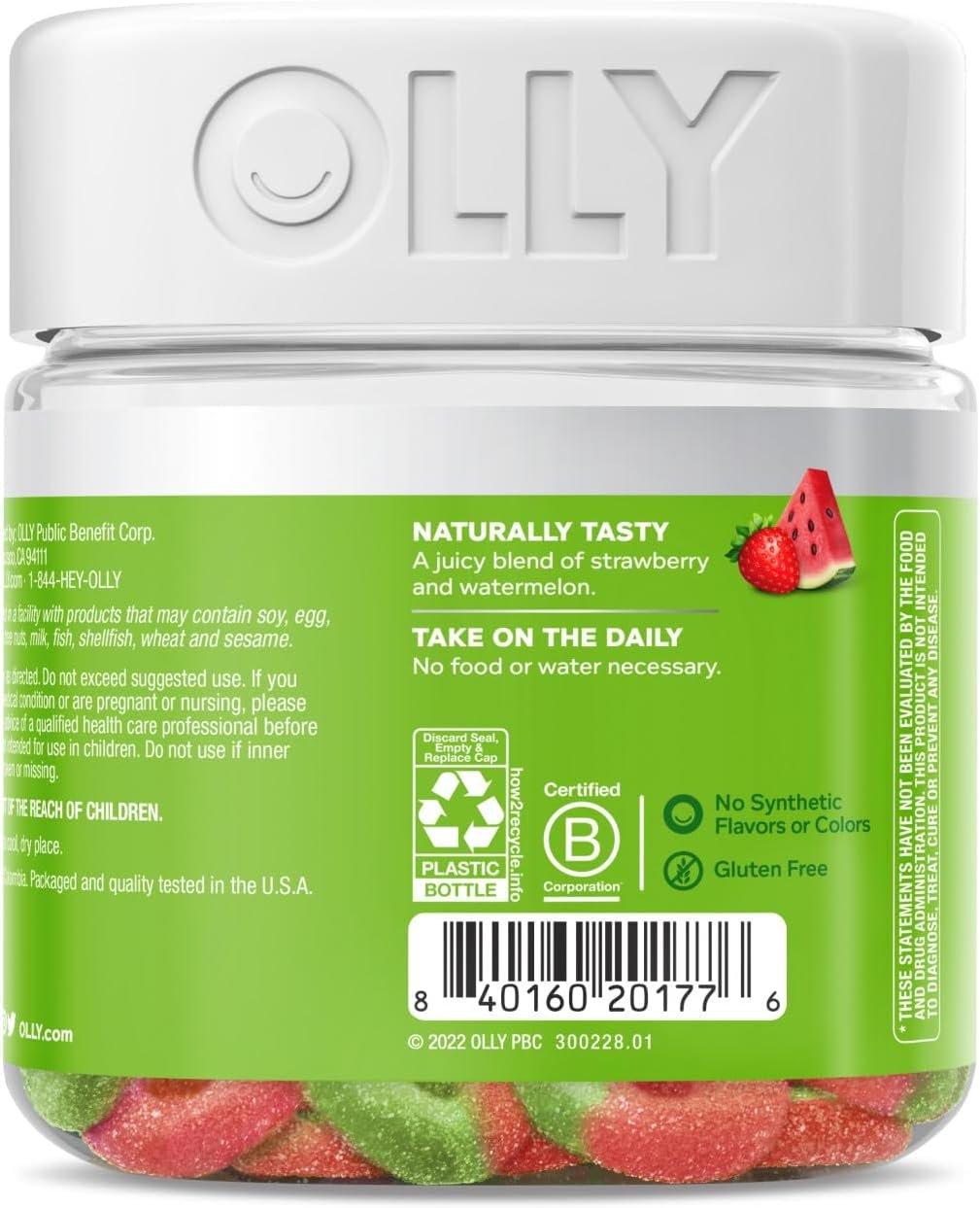 OLLY berry melon flavor Fiber Gummy Rings are a fabulously fruity way to support bowel and digestive health.* The goods inside: Fructo-oligosaccharides, or FOS for short, is a good source of soluble fiber and supports normal bowel function and a healthy gut microbiome.* Getting enough fiber in your diet can be tricky, even for the biggest fans of fruits & veggies. But with their juicy blend of strawberry and watermelon, these gummy rings deliver fiber with flavor. Not only are they tastier than a bushel of broccolini, they also pack 5 g of Prebiotic fiber into every serving. Adults, take 2 gummies daily. Chew thoroughly before swallowing. At OLLY, good health is at the center of everything we do. We make delightful vitamins and supplements with real-deal benefits that help you live Happy Inside Out.* *These statements have not been evaluated by the Food and Drug Administration. This product is not intended to diagnose, treat, cure or prevent any disease.