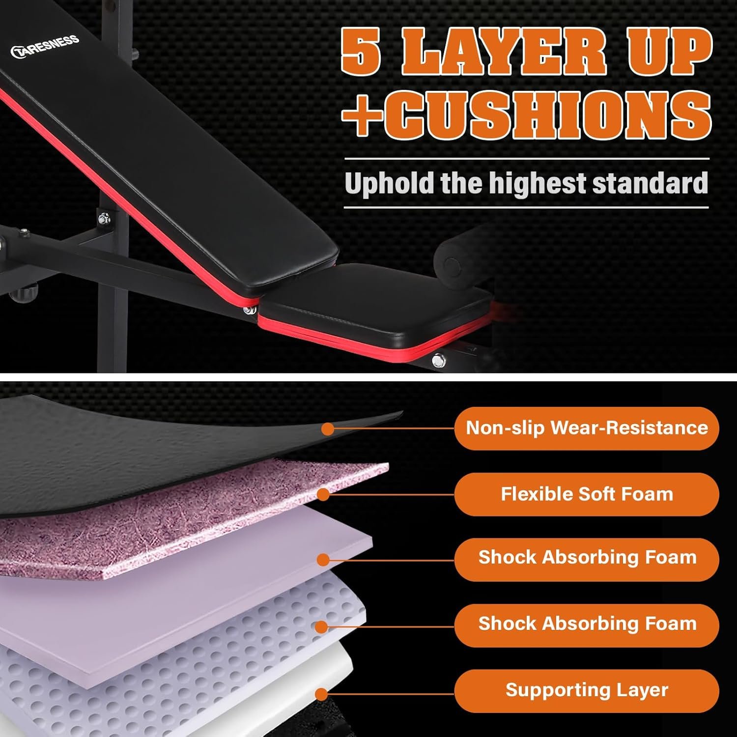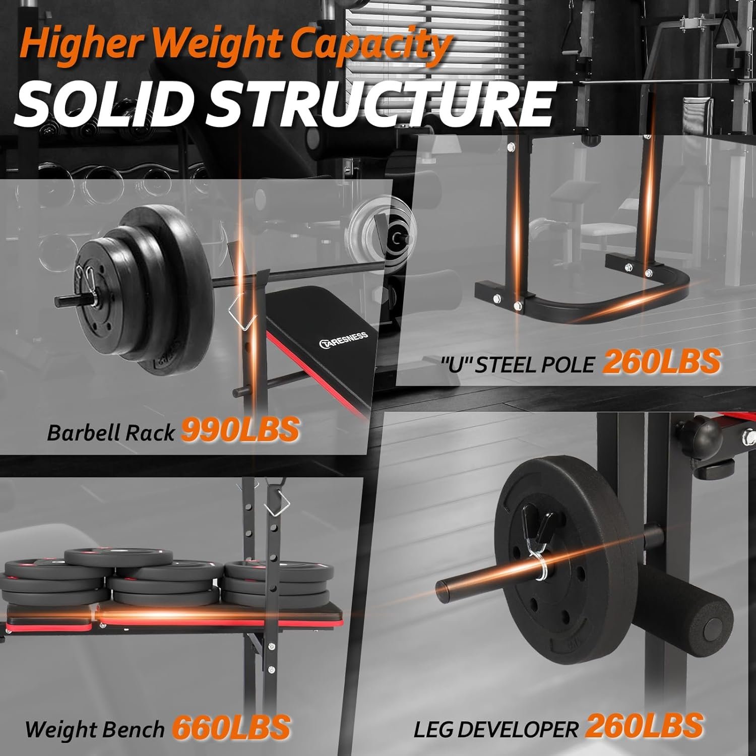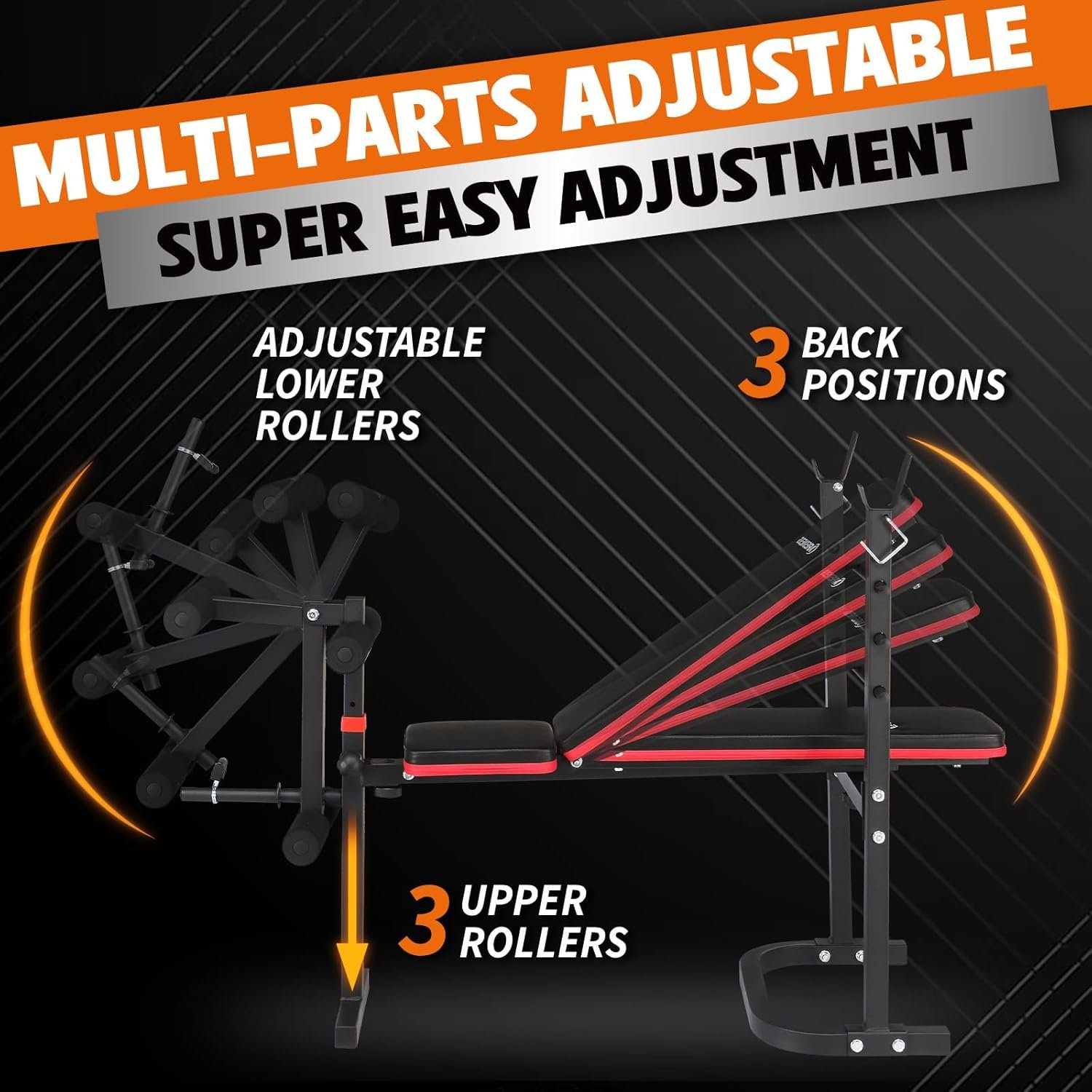 WHOLE BODY WORKOUT: Designed for full-body training at home, this weight bench can be utilized to target multiple muscle groups, such as arms, legs, chest, and core. Not only comes with a squat rack but also comes with a multifunctional leg developer to support you in performing leg lifts, leg curls and chest military presses