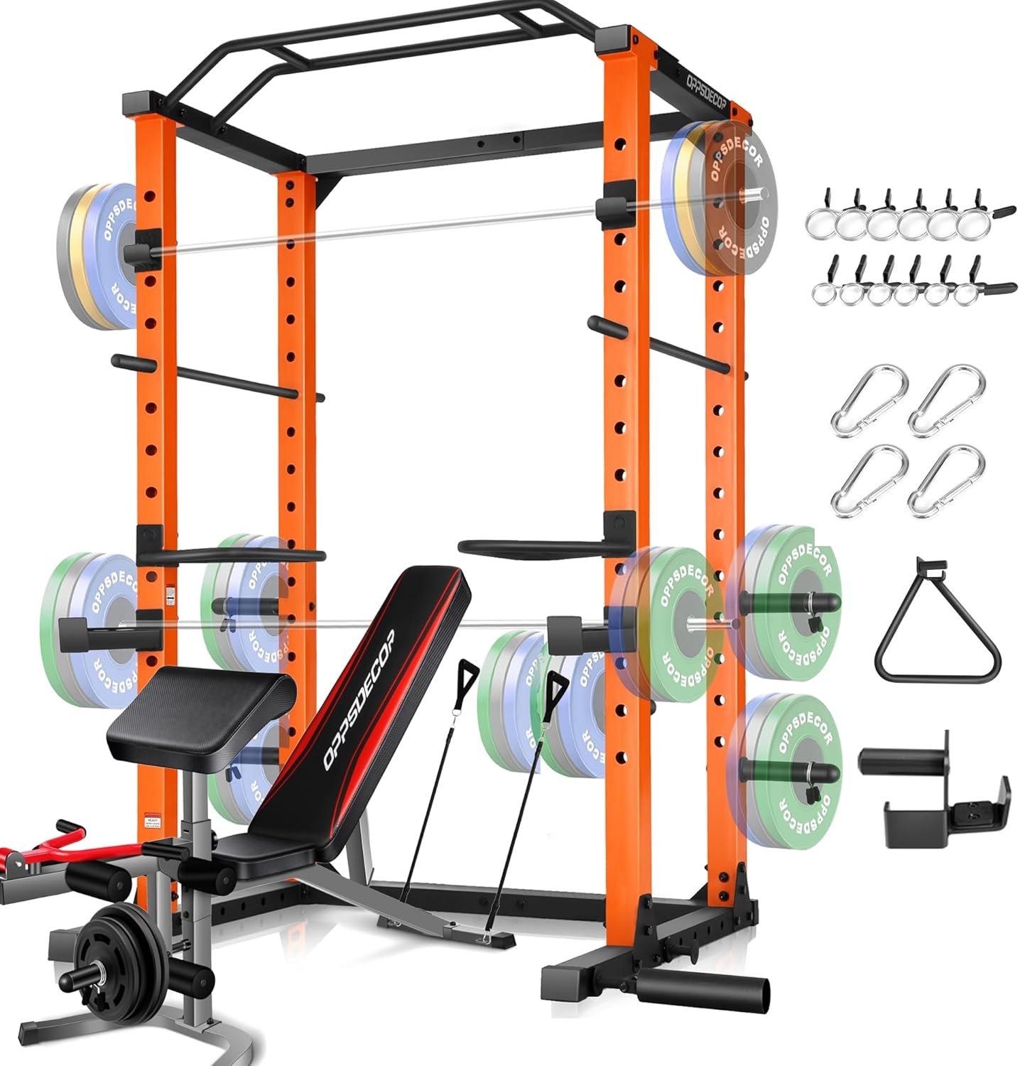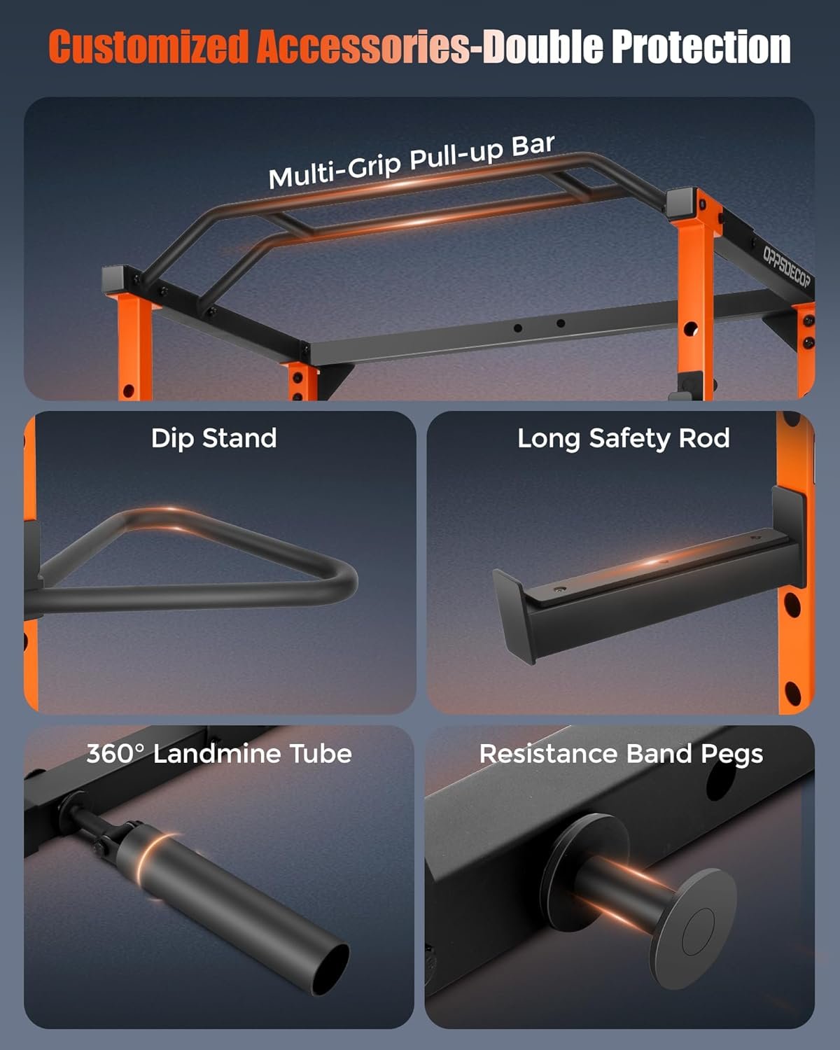 【Customerized Your Adjustable Power Cage】All come with Oppsdecor home gym power cage, It includes: lat pull-down bar*1, cable bar*1, cable handle*2, J-Hook*2, safety frame*2, safety rod*2, wide&narrow pull-up frame, dip bar*2, 360° landmine*1, foot board*1, band peg*2, 1″&2″ barbell clamps*6. You can customerized your own training plan, 14 Level Adjustment for Barbell Spotter, J hooks, Safety Catch, Dip Station; 5 Level Adjustment for Band Anchor; 360° for Landmine Axle.