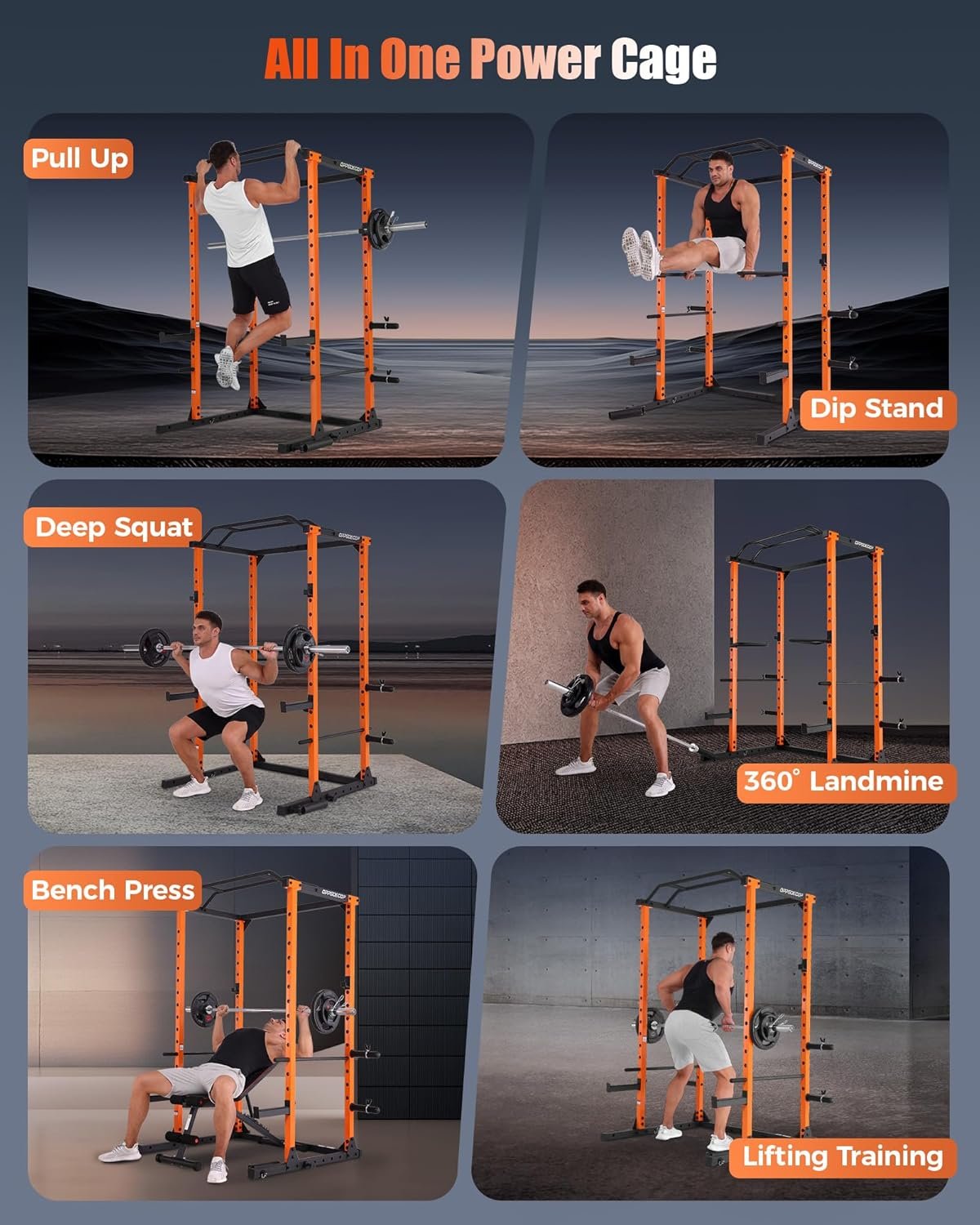 【Versatile Workouts】Our multi-functional power rack is adeptly designed to cater to both novices and athletes. The workout machine incorporates a range of attachments for versatile workouts, such as dip station, pull up, chin up, push up, etc. We are also equipped with upper and lower pulley system for lat pulls down, seated rowing. This power rack cage gives you the flexibility for various strength training workout, within a safe environment and in a compact space.