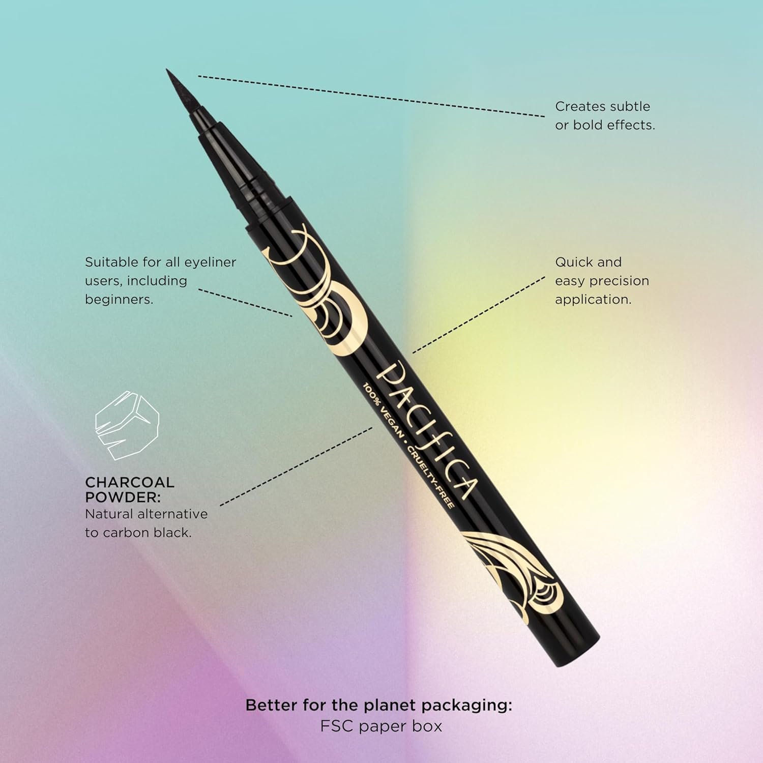SKIP-FREE, SMUDGE-PROOF EYELINER formulated with charcoal powder delivers silky-smooth, precision-sharp application.