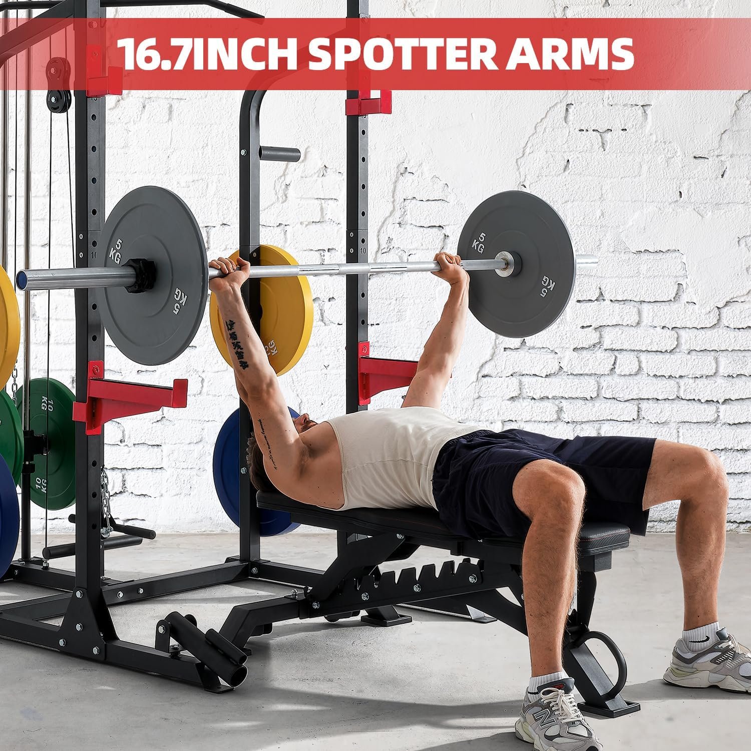 【Best Versitile Gym Equipment for Home】The half rack with bench is a versatile piece of equipment that can be used for a variety of exercises, such as squats, bench press,shoulder press, and deadlifts. Additionally, the pull up bar, landmine can add more exercise.