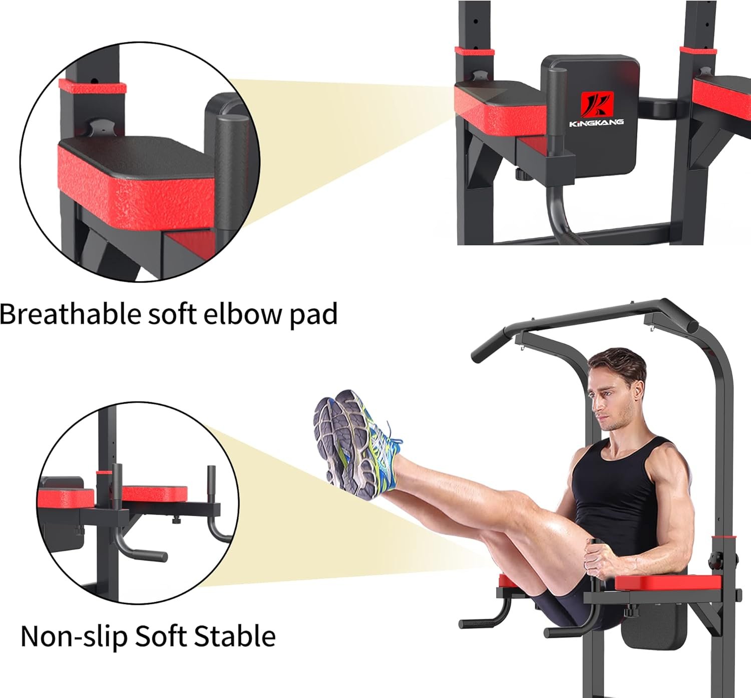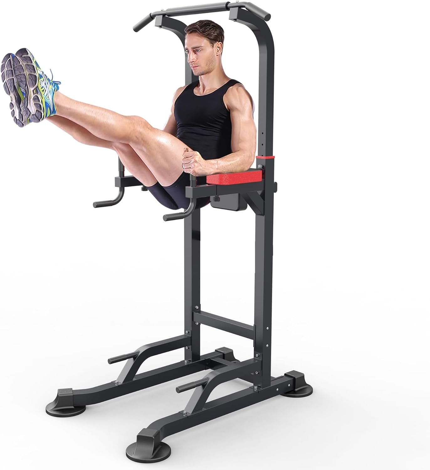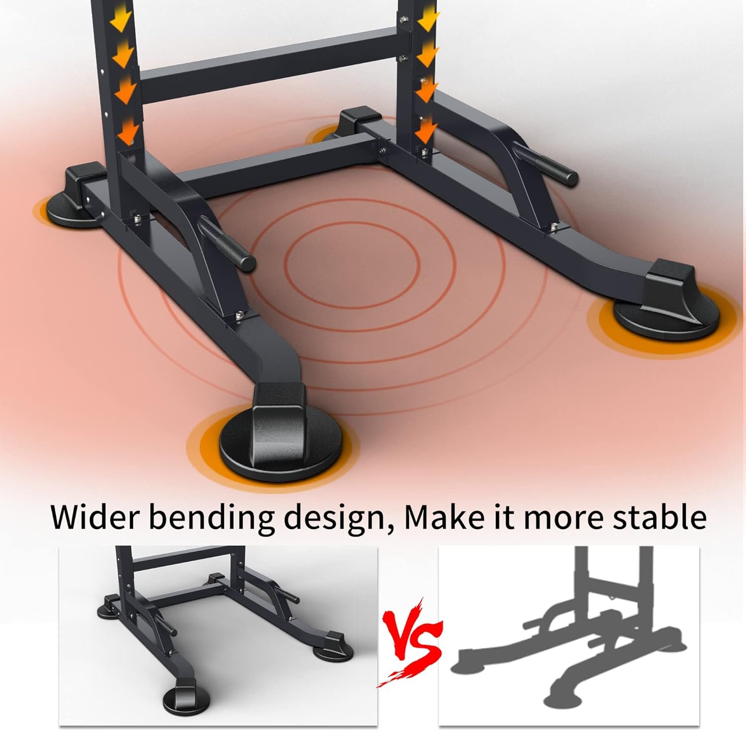 【Bend Suction Cups】This dip stands owns a unique Bend suction cups in the bottom, which can adjust the flatness that contacts with the ground. Made the power tower more Safety and strong stability.