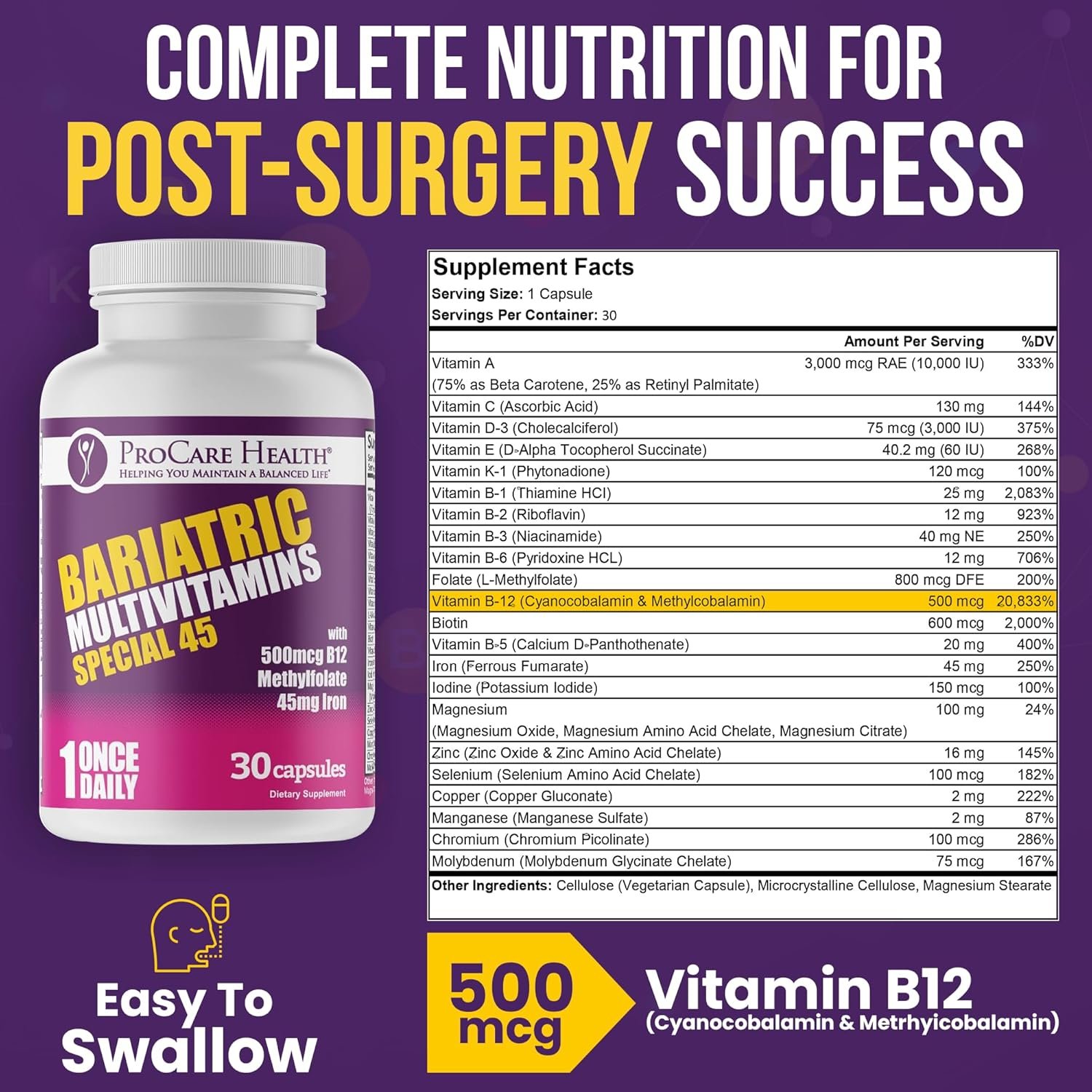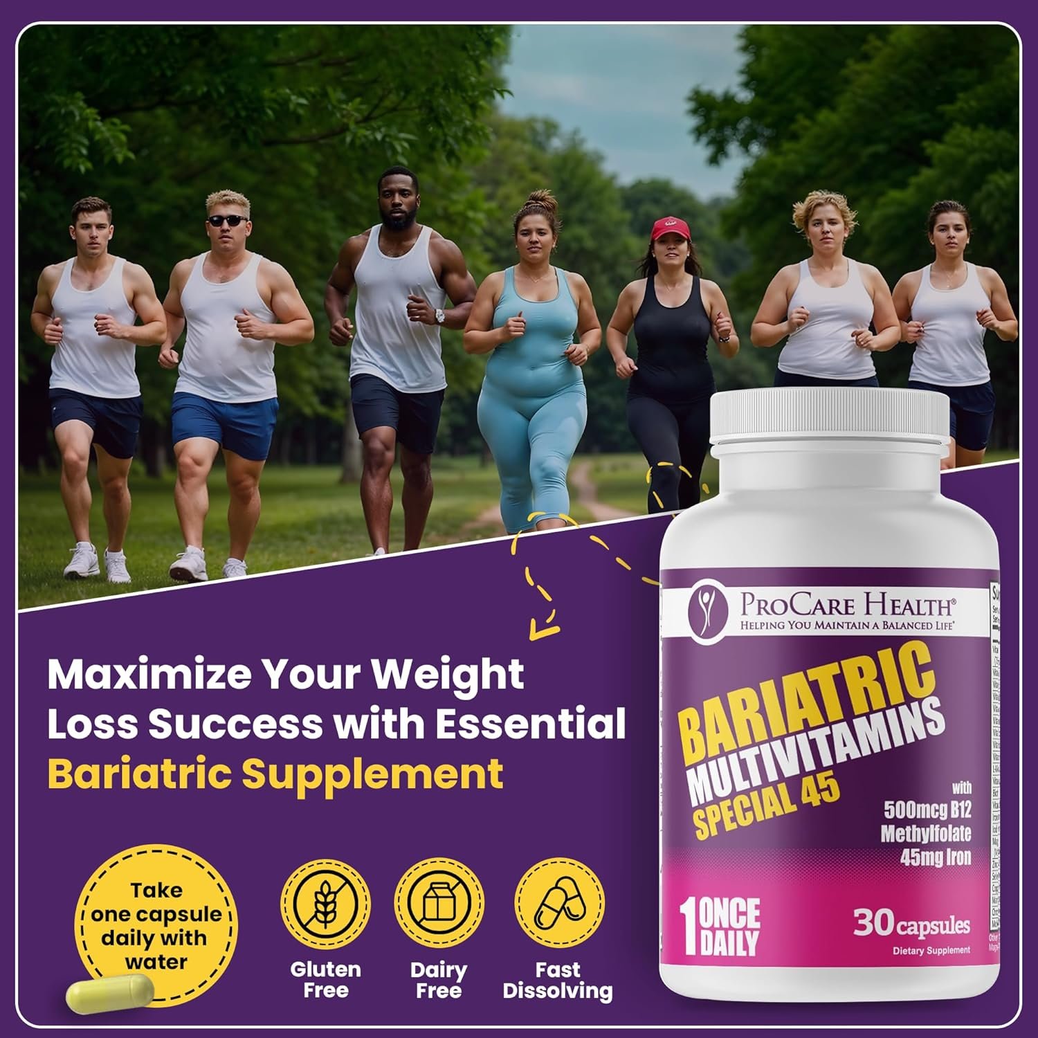 Developed with Bariatric Doctors and Dietitians ProCare Health’s capsule multivitamins are a great and affordable solution to get the nutrients the body needs! ProCare Health’s SPECIAL formula once-daily multivitamin is a great option that addresses the unique needs of some patients. B12 is one of the hardest supplements for your body to absorb, this is why it is such a high dose. From monitoring patients’ blood work through our partnerships with bariatric programs ProCare Health has found some patients absorb the B12 in our vitamins at an above-average rate. This called for a lower B12 level needed in a supplement. ProCare Health “1 per Day!” Bariatric Multivitamin Capsule – Special 45 uses Methylfolate instead of Folic Acid, both are forms of vitamin B9. Methylfolate is the naturally occurring form of vitamin B9. Vitamin B9 serves many important functions in your body. For example, it plays a crucial role in cell growth and the formation of DNA. MTHFR gene mutation handles the breakdown of the vitamin folic acid. This breakdown leads to elevated levels of homocysteine. Homocysteine is a chemical produced from an amino acid in our bodies when folic acid breaks down. If folic acid isn’t broken down, it will block the body’s ability to have enough folate. It’s estimated that 1 in every 3 individuals has the MTHFR genetic mutation. The last difference between this SPECIAL formula and ProCare Health’s original is a higher Thiamine amount. The body is incapable of producing thiamine and can store only 30mg in tissues. It is mostly in skeletal muscles but also can be found in the brain, heart, liver, and kidneys. Its storage in the body is limited, and it can be exhausted quickly. This is why having a sufficient amount is needed. Additional Thiamine is often suggested after Bariatric Surgery. Thiamine plays an important role in carbohydrate metabolism, nerve conduction, and the actions of the heart and muscles.