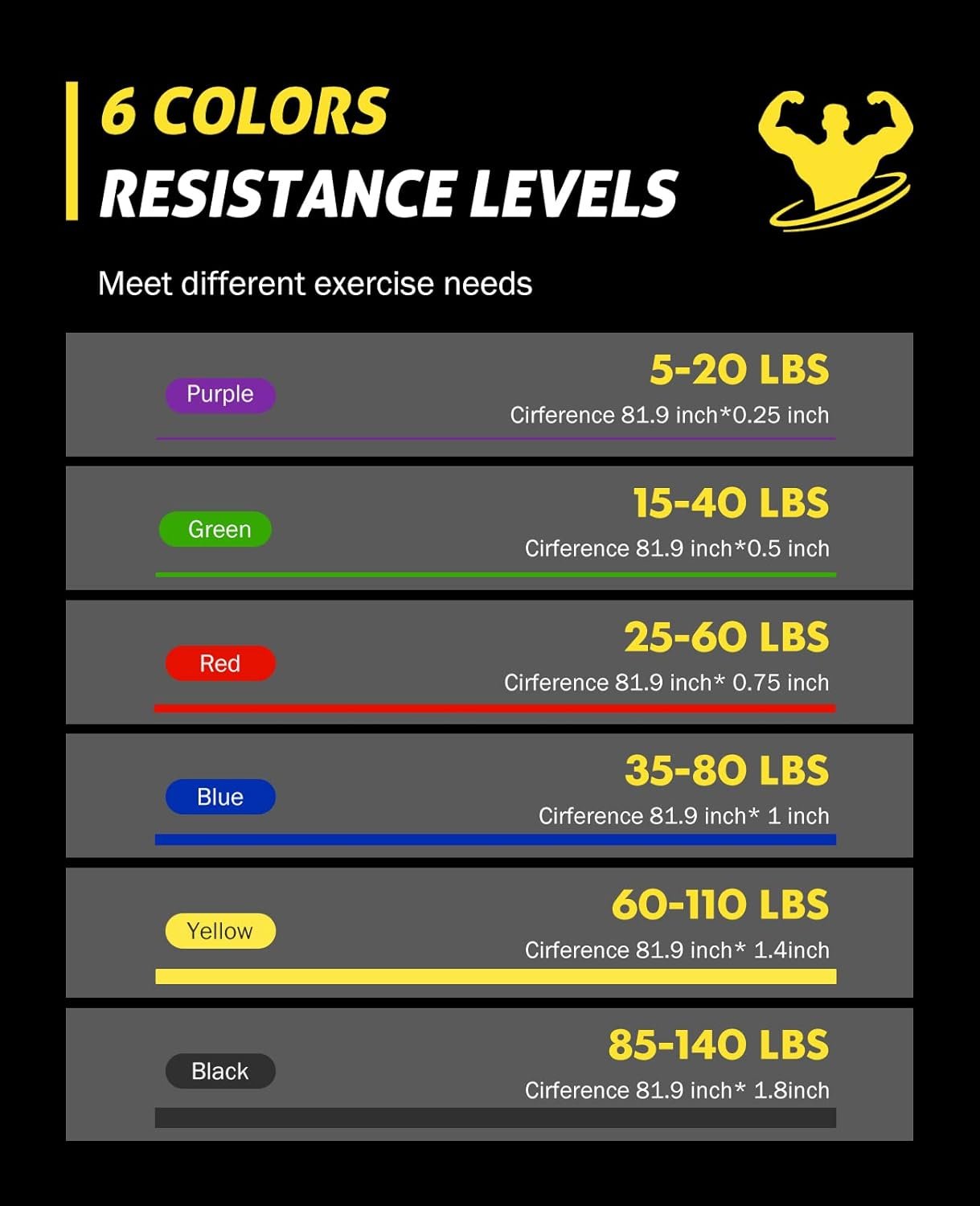 Different Color & 6 Pull-Up Band Levels: A set of 6 resistance bands, each corresponding to a different color—Purple (5-20 lbs), Green (15-40 lbs), Red (25-60 lbs), Blue (35-80 lbs), Yellow (60-110 lbs), Black (85-140 lbs) Each band is 81.9 inches in length and can be used alone or combined with other bands to increase the challenge Suitable for individuals weighing between 90 lbs and 300+ lbs