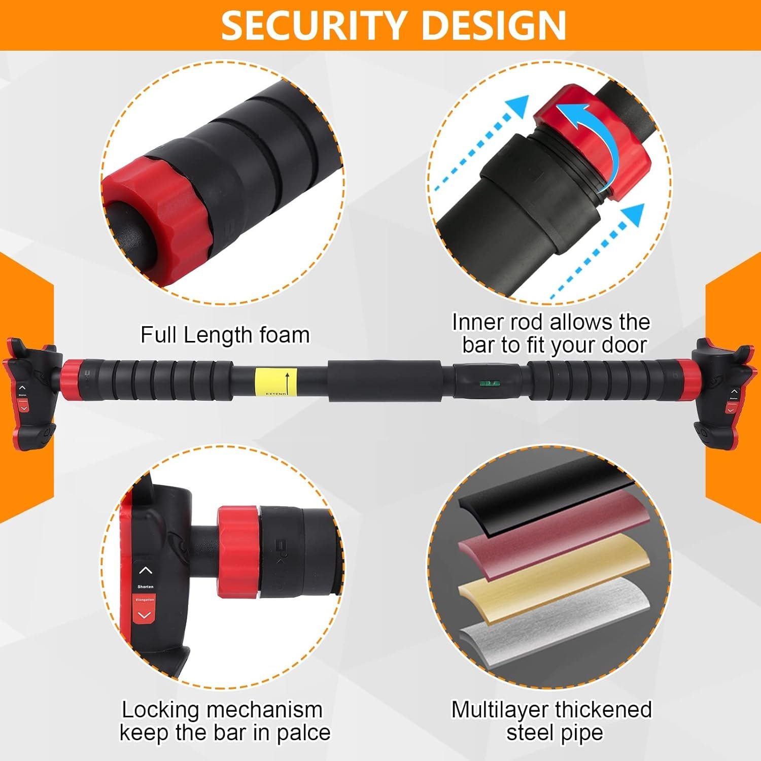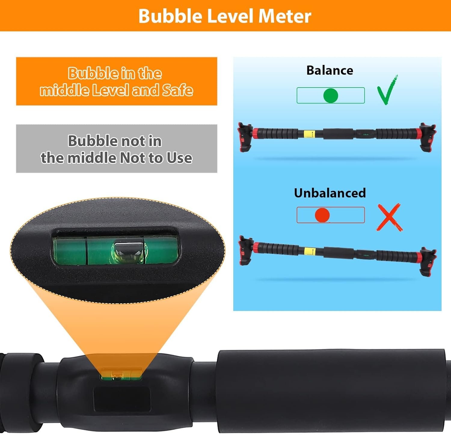 💪【NO SCREWS & NO DRILLING】No screw, no drilling, perfectly protect your door frame and wall. Upper body workout bar is equipped with level meter, through the middle position of the bubble to judge that the pull up bar is in a level state or not.