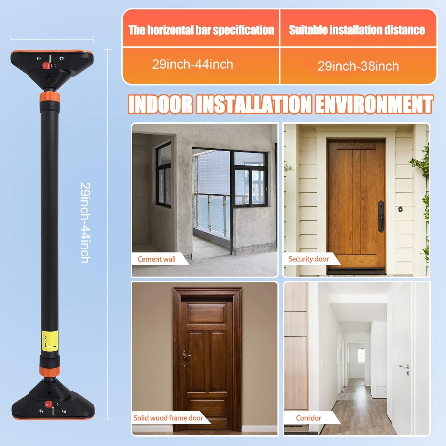 EXPANDABLE CONSTRUCTION: The doorway pull bar fits any standard doorway width from 29 inches to 38 inches. Portable design, no screws, no holes in the wall, no damage to the door. Installation is simple and assembles in seconds. You can remove the pullup bar after your workout.