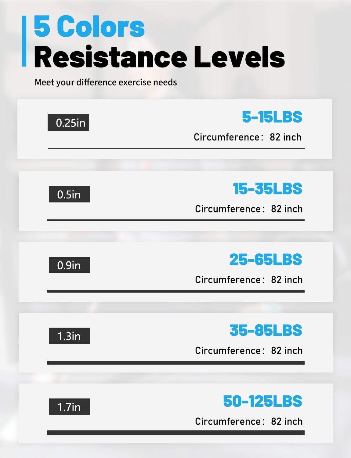 For All Strength Level: 5 different strength levels :5-15 lbs, 15-35 lbs, 25-65 lbs, 35-85 lbs, 50-125 lbs, these exercise bands will help you upgrade your fitness training from a newbie to a veteran. These fitness bands can be used alone or combined multiple workout bands to increase the challenge. Start now and build your dream body