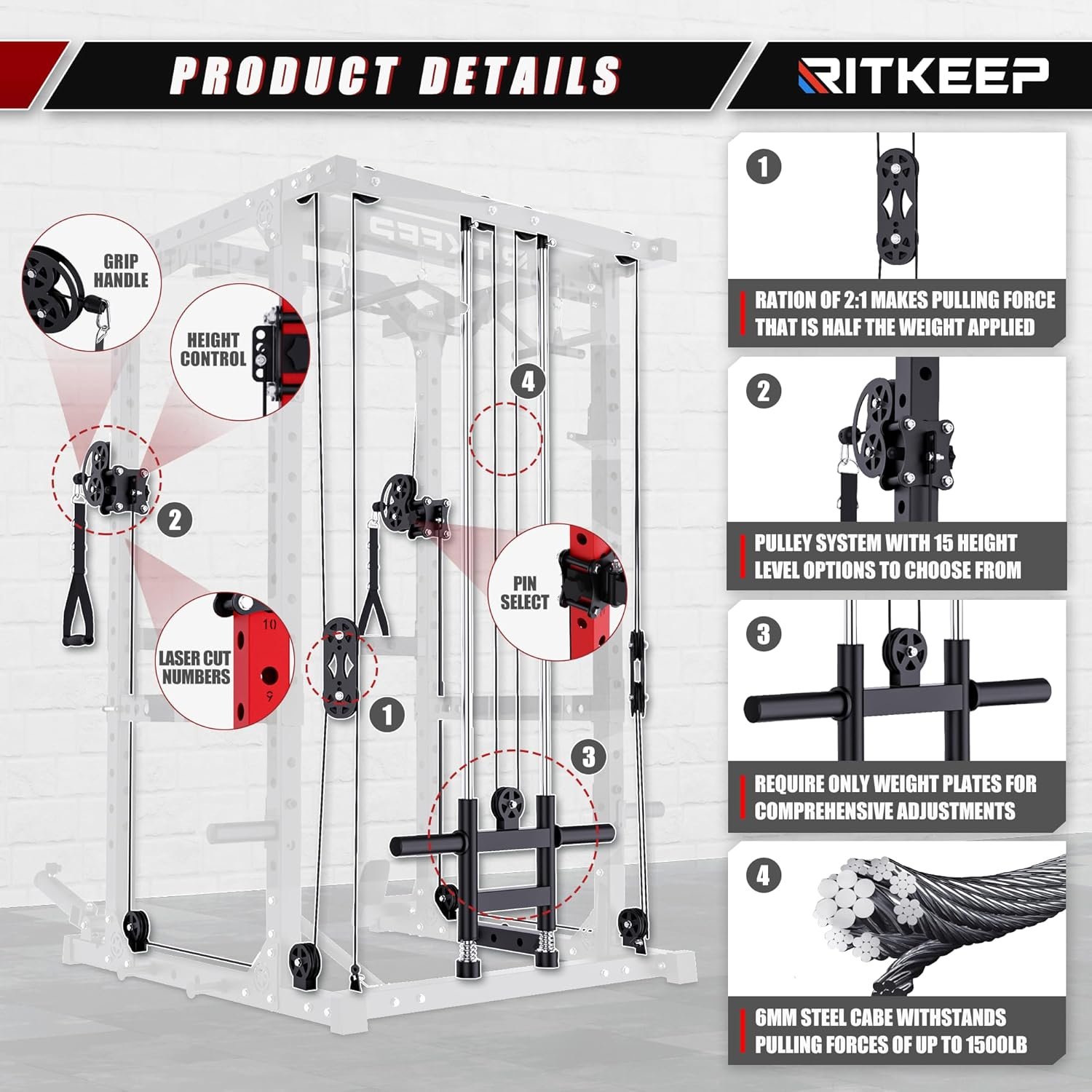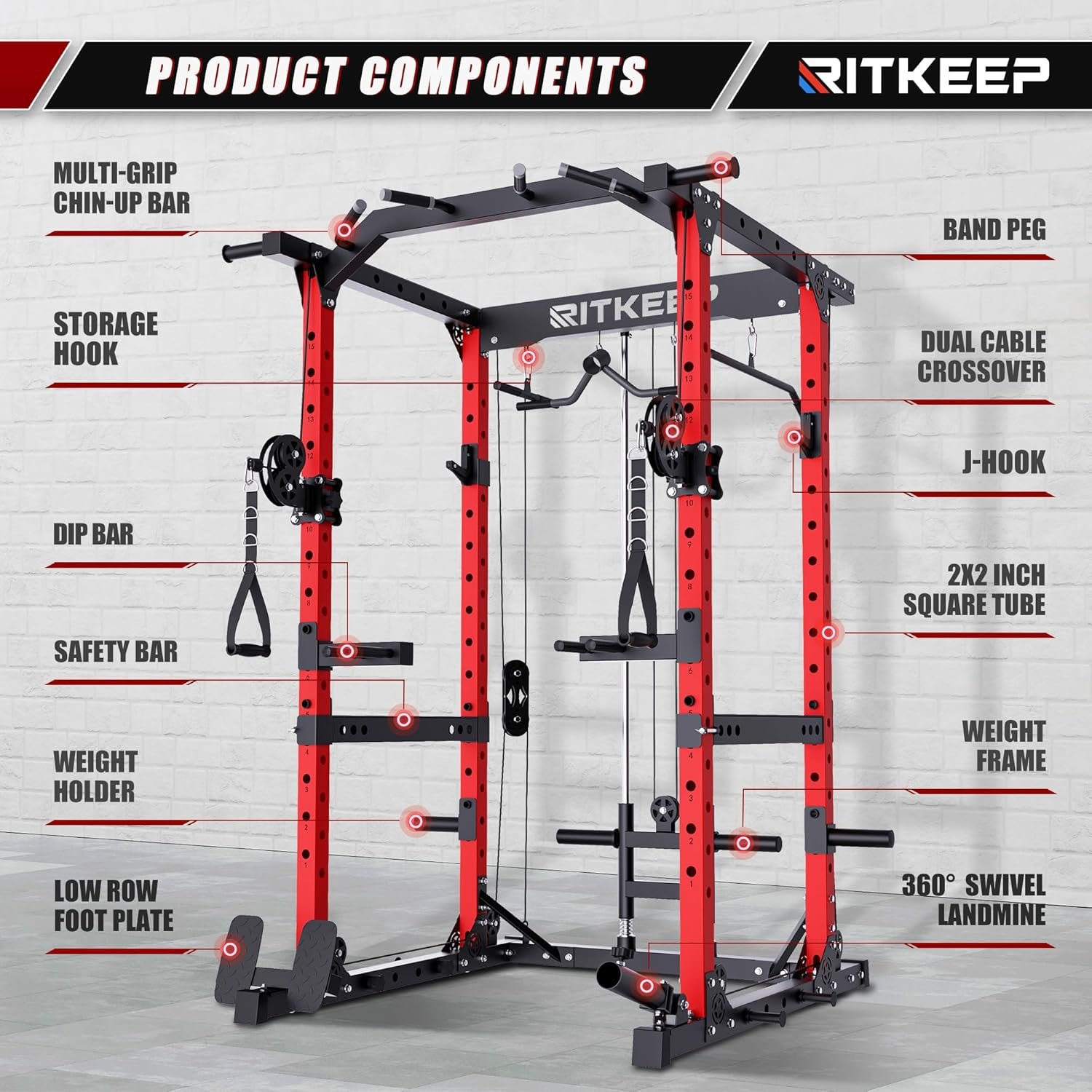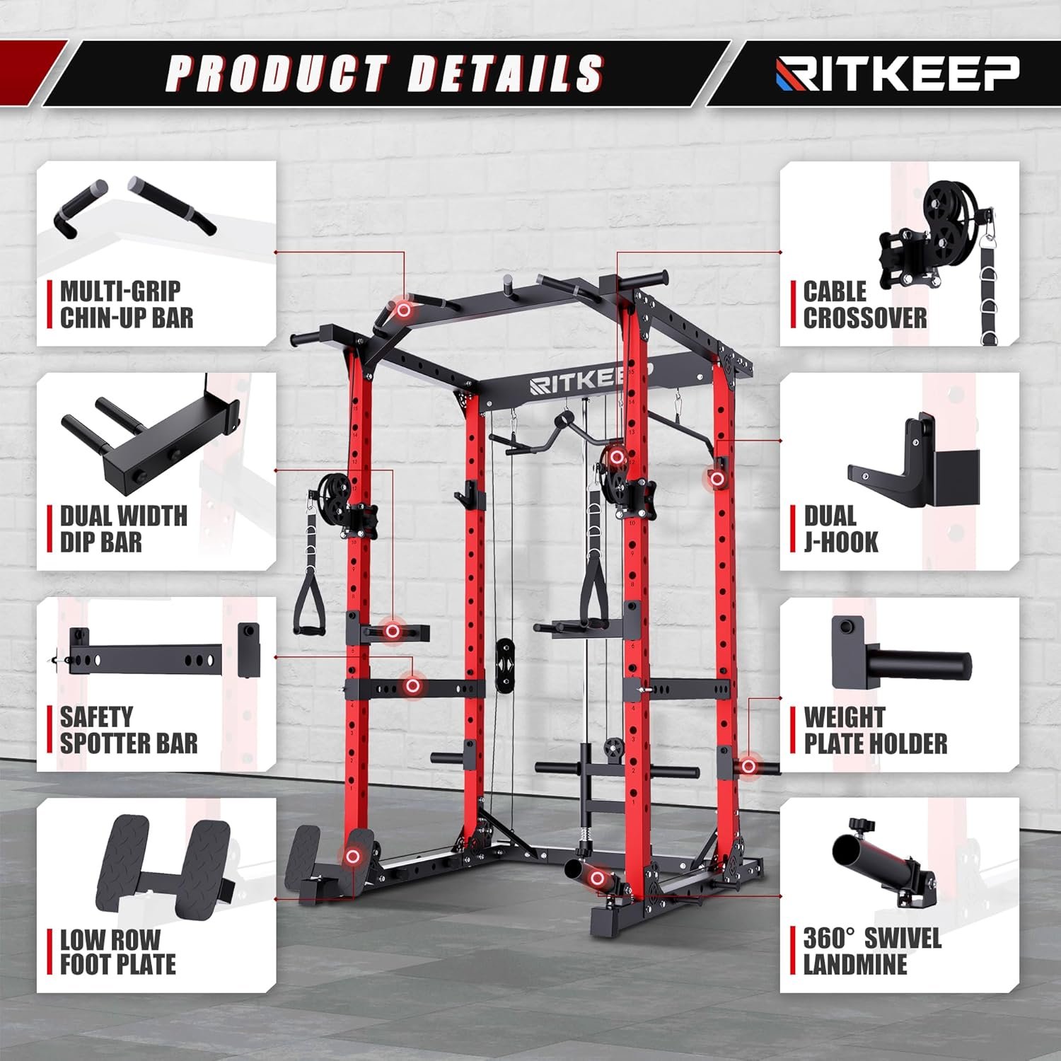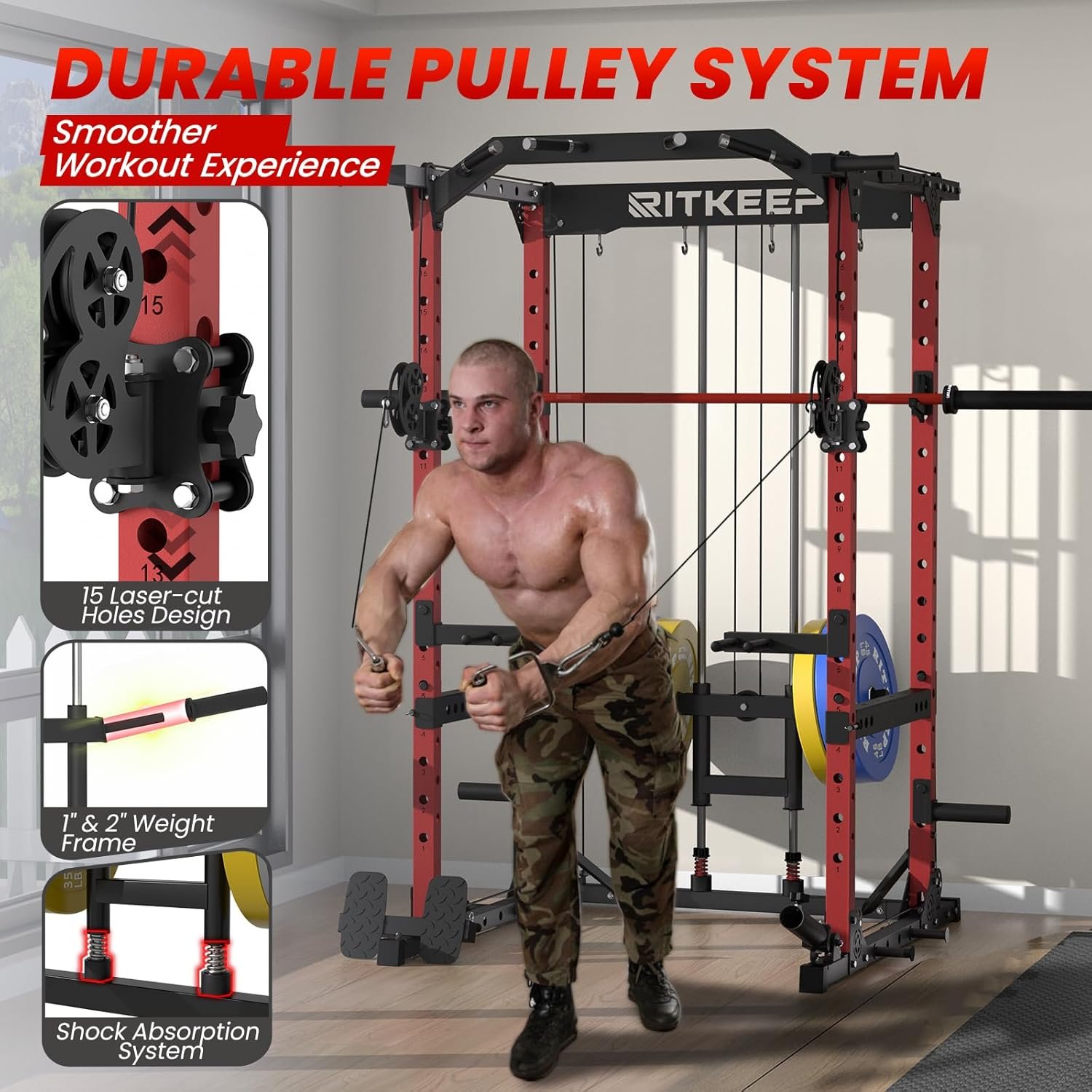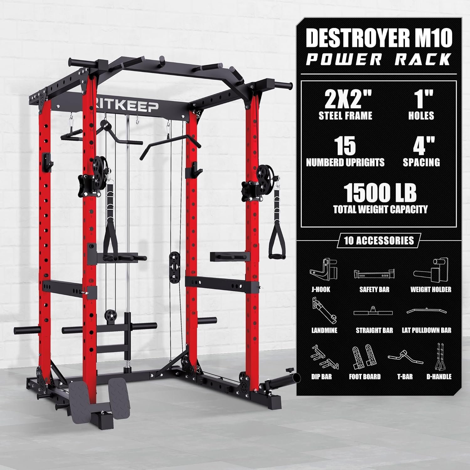 The RitKeep Destroyer M10 Fitness System offers ultimate versatility, combining a Power Rack, Chin-up bar, Dual Pulleys, and practical attachments, all crafted with stable manufacturing and a durable pulley system for a comprehensive, smooth workout experience.