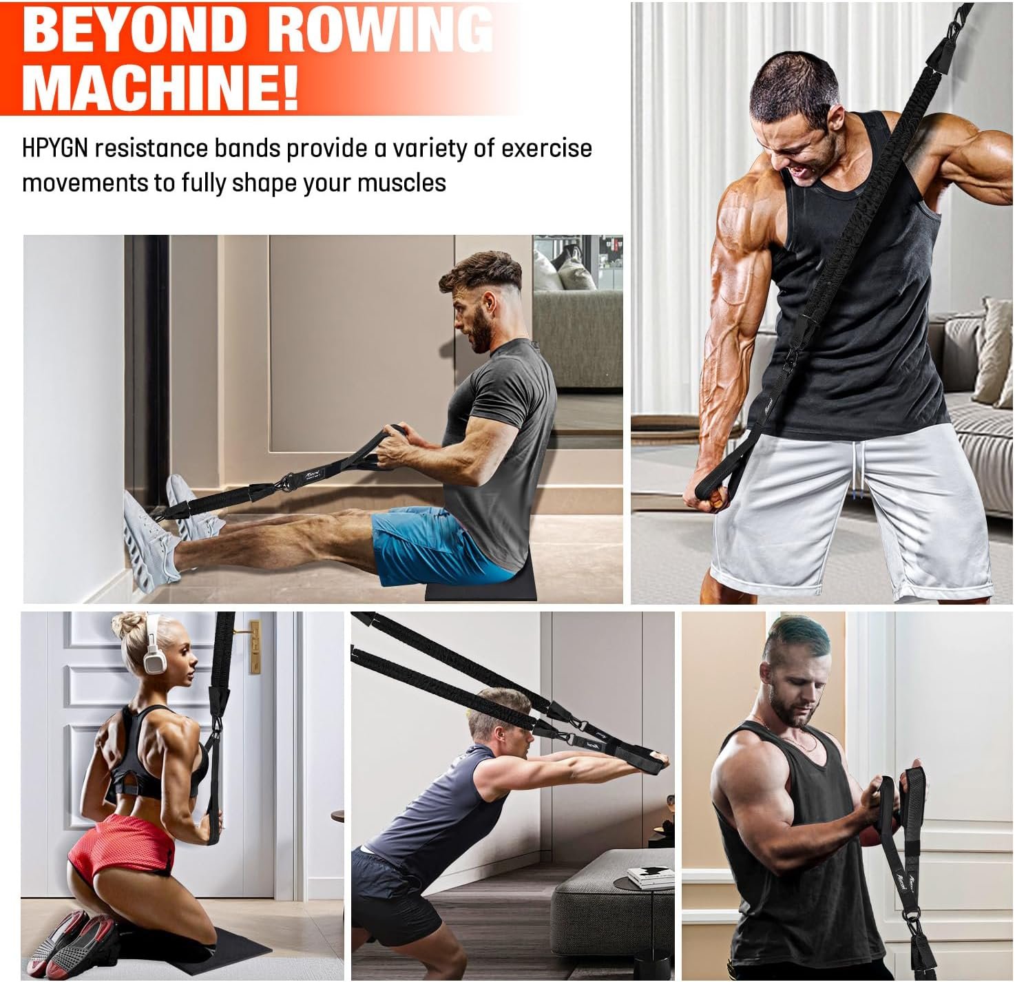 Our resistance bands are not only used for rowing, but also for various fitness exercises such as bicep bending, upward movement, sitting, and rope pulling. In just 30 minutes, they activate over 90% of your body’s muscles, promoting balanced development and strength! No matter when or where, HPYGN resistance bands are the perfect companion for effective full body exercise.