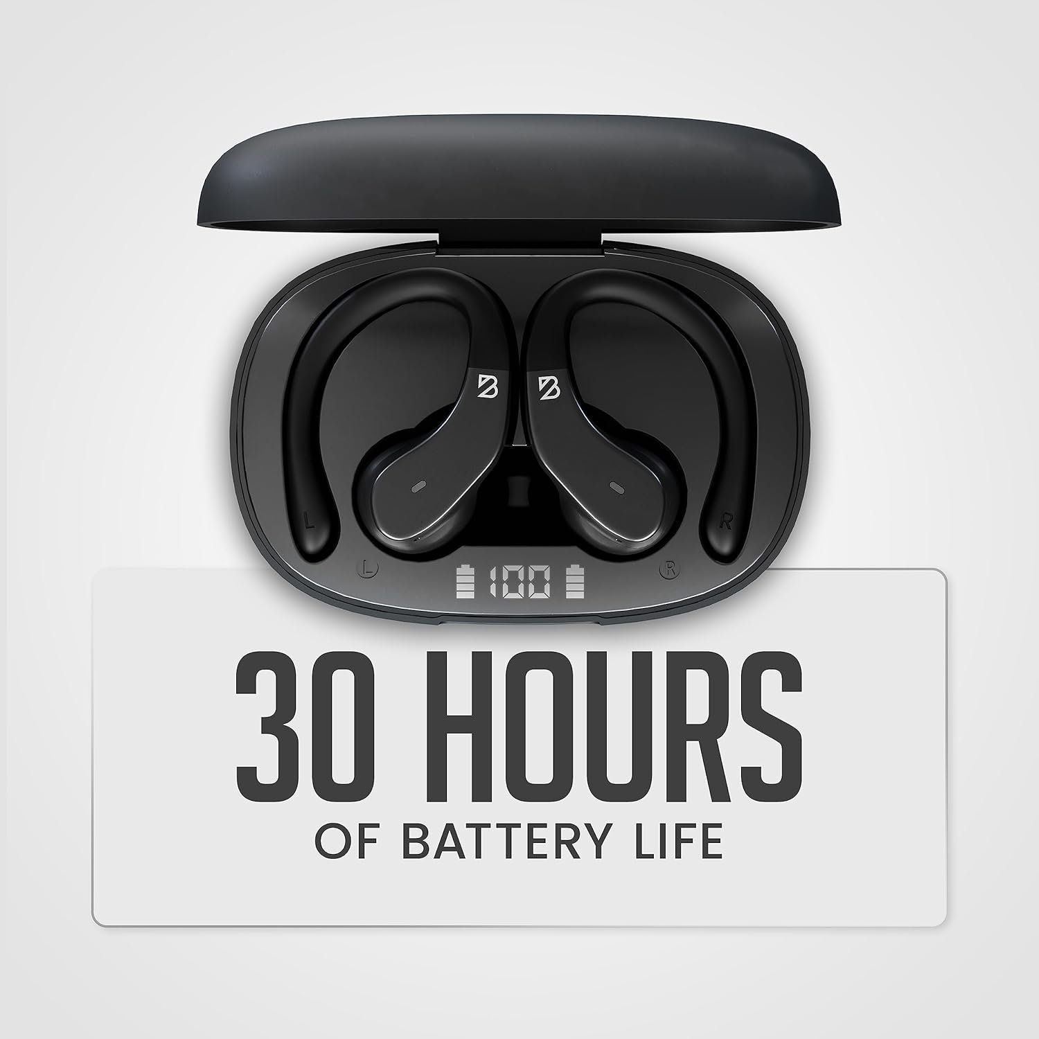 30 Hour Battery Life + USB-C Charging: Each of the over ear Bluetooth ear buds can play music for 6 hours, and the charging case keep the wireless earbuds running with 24 hours of music