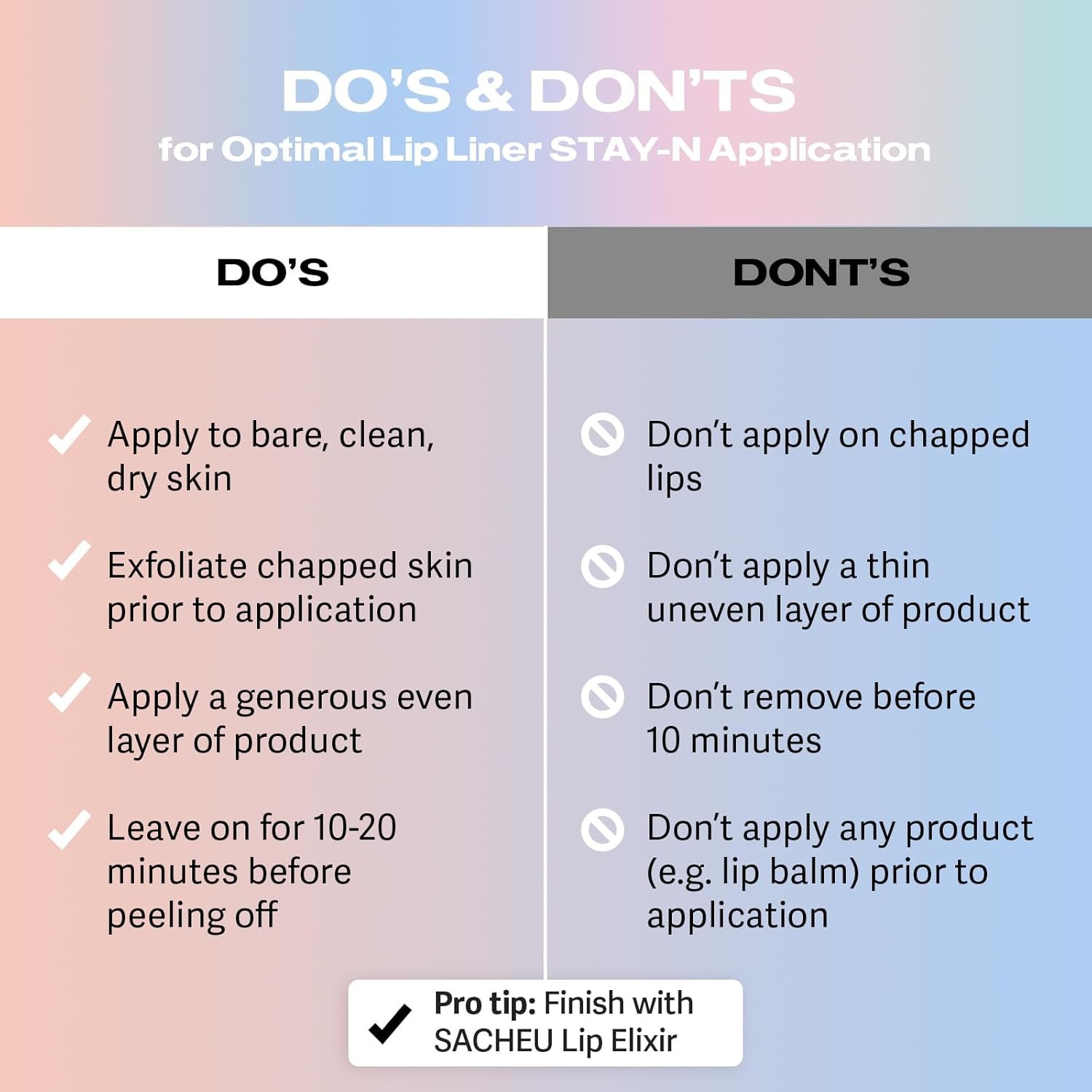 INSTRUCTIONS – Trace along the lip line with a generous, even layer. Leave on for up to 20 minutes. After the formula has set, slowly peel the film tint off to unveil a smudge-proof, semi-permanent lip color! TIP: DO NOT USE ON DAMAGED OR BROKEN SKIN. Lip Liner STAY-N works best on clean, exfoliated, dry skin.