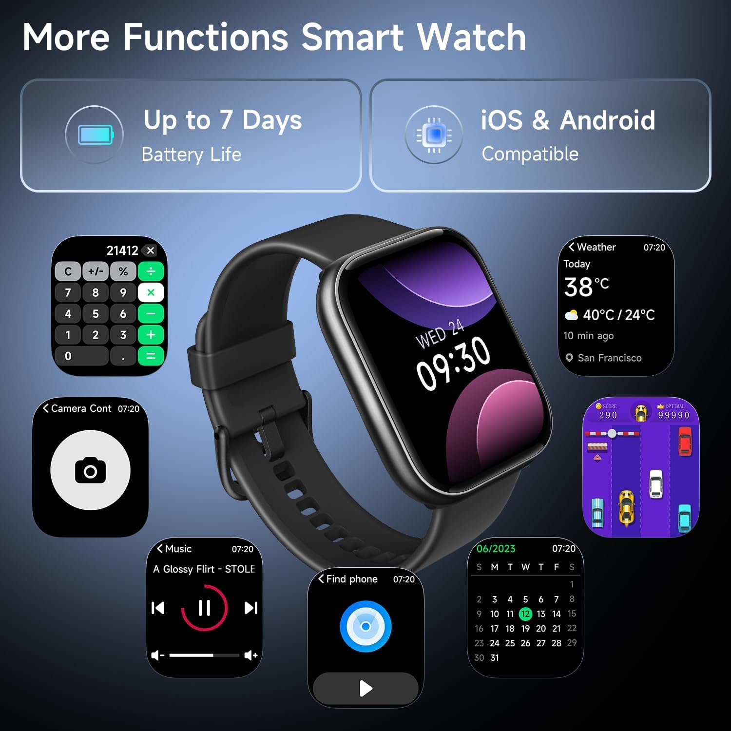 Widely Compatible: WMK smart watch for android phones is compatible with iOS 9.0+ and Android 6.0+ devices. This smart watch has multiple functions such as a alarm clock, find your phone, sedentary reminder, brightness adjustment, photo control, and games