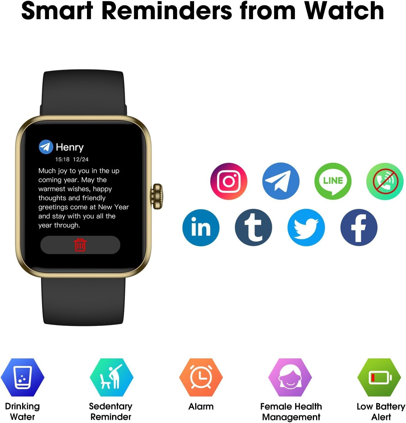 Get Reminders on Watch: After connected, the smart watches can receive notifications for SMS and App. You won’t miss important messages from your lover/friends. Also, Imzuc watch has a sedentary alert function and you can create reminders for drinking water, meetings, appointments and more in the alarm settings, making daily life and workout more concise and intelligent.