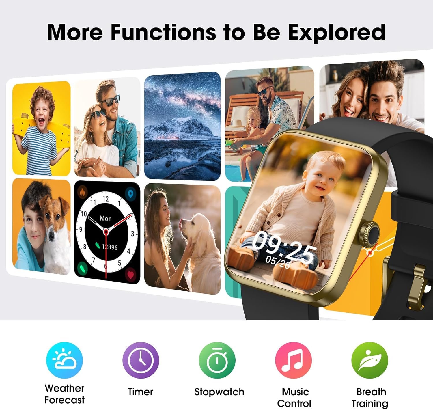 Personalized Watch Dials with More Functions: The fitness watch for women comes with 100+ In-App theme dials or set up your photos as watch faces, allow to create personalized style. Also, the sports watch supports music control, view the local weather, phone search function, stopwatch and more, giving more convenience and fun to your life.