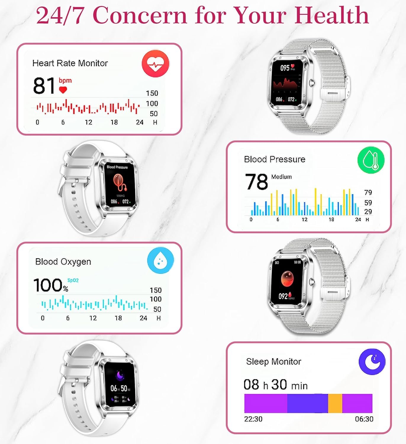 All-day Heart Rate Monitor & Sleep Tracker: This android smartwatch for women has advanced sensors to help you detect and accurately monitor heart rate, blood oxygen, and blood pressure throughout the day. (Non-medical equipment, the data is for reference only) The sleep tracker can automatically track your sleep and analyze your sleep quality (deep sleep, light sleep, and wakefulness) to help you adjust your lifestyle.