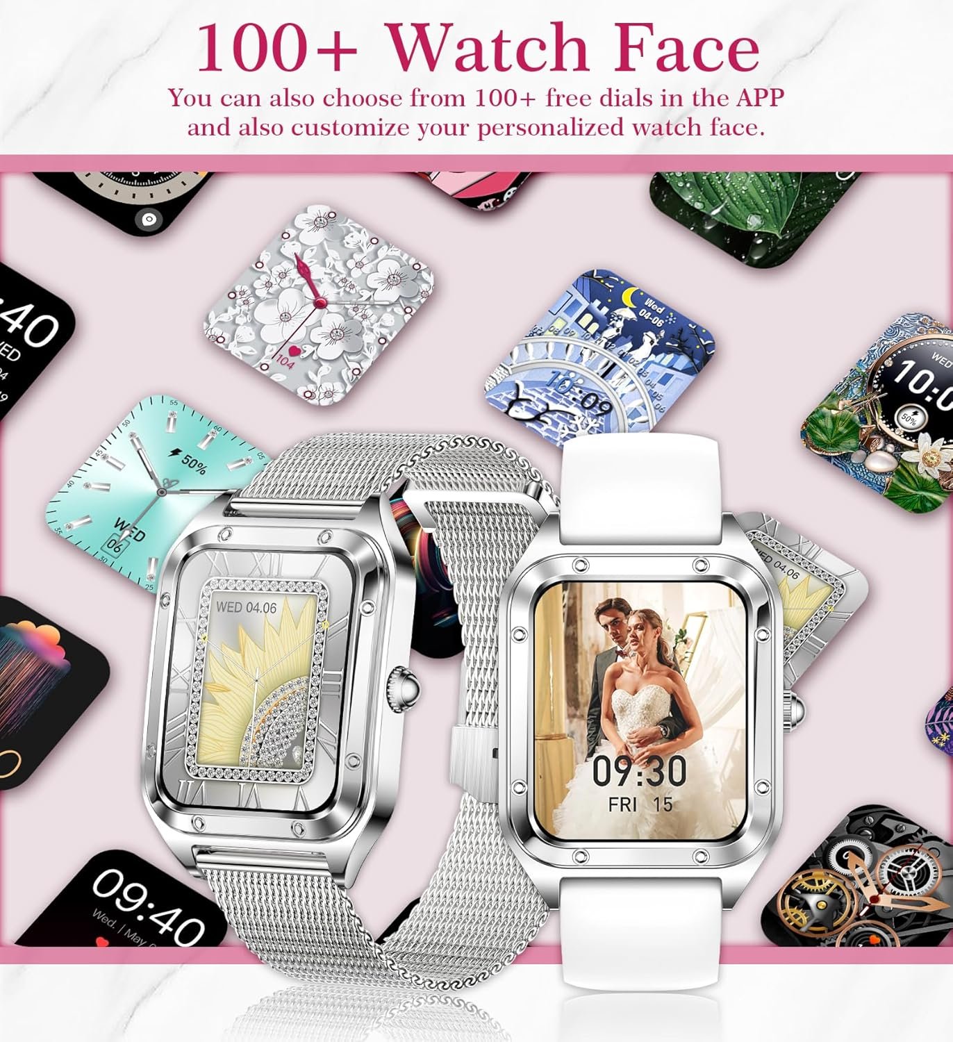 Fashion smart watch for women: The 1.6-inch smooth touch response and detailed picture quality bring you a unique visual and better interactive experience. You can choose from 200+ dials in the APP, and you can also choose your favorite pictures to customize your own dial. Comes with 2 watch bands, the silver steel band is elegant and stylish, and the white silicone band is casual and simple, allowing you to match it as you like.