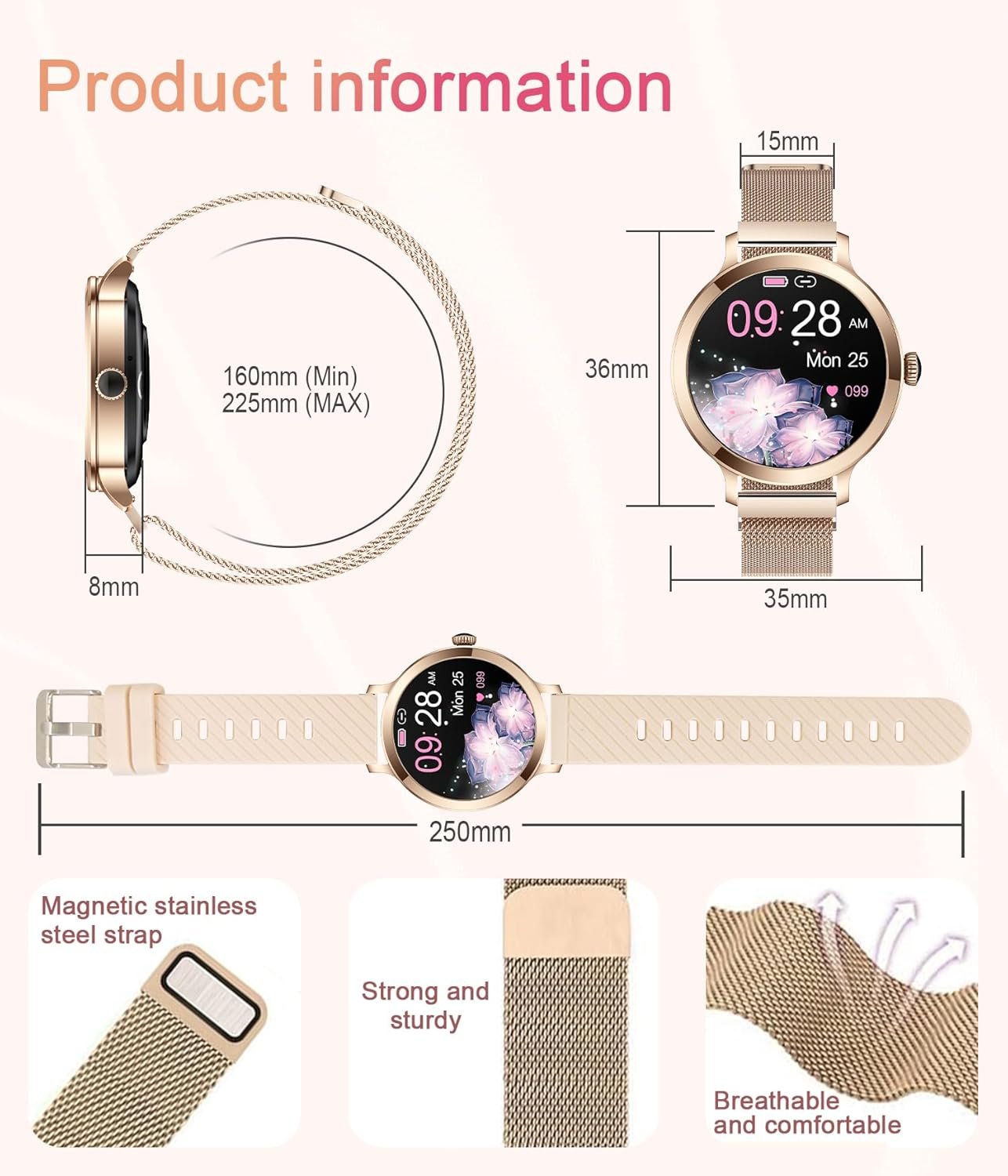 Two Watch Straps and DIY Watch Faces: Smart watch for android phones is equipped with 2 different stainless steel straps and 1 silicone strap, allowing you to switch on various occasions. There are many personalized watch faces for fitness smartwatches for women that can be downloaded and used in the app. In addition, you can also choose your favorite photo or picture as a watch wallpaper