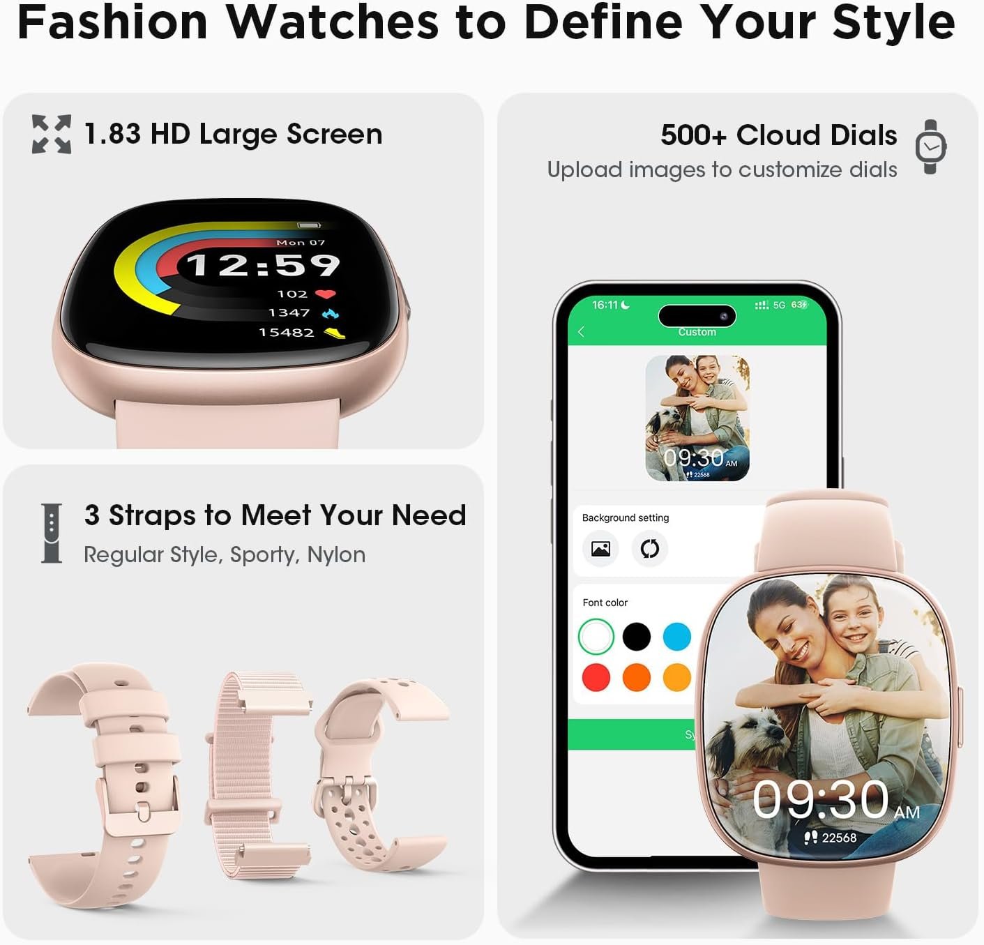 Customized 1.83″ Dial: Smart watches for women has a 1.83-inch touch screen with 4 levels of adjustable brightness for clearer display and easier operation in sunlight. With more than 500 unique online dials to choose from, you can also select a photo from your phone as your dial to commemorate your sweet love